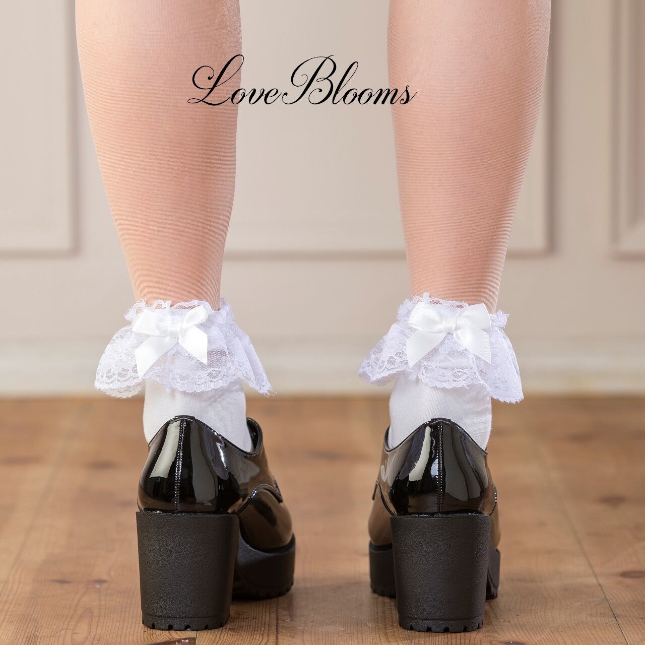 フリルレースのデザインが足元を華やかに演出し、リボンがアクセントになって可愛さを倍増させます。ロリータファッションや地雷系アイテムとの相性も抜群です。