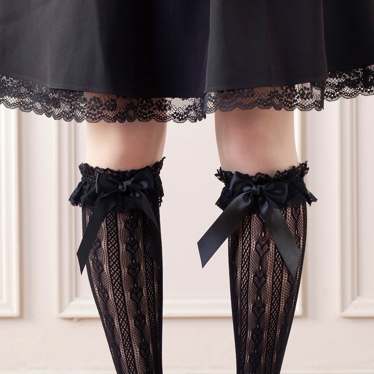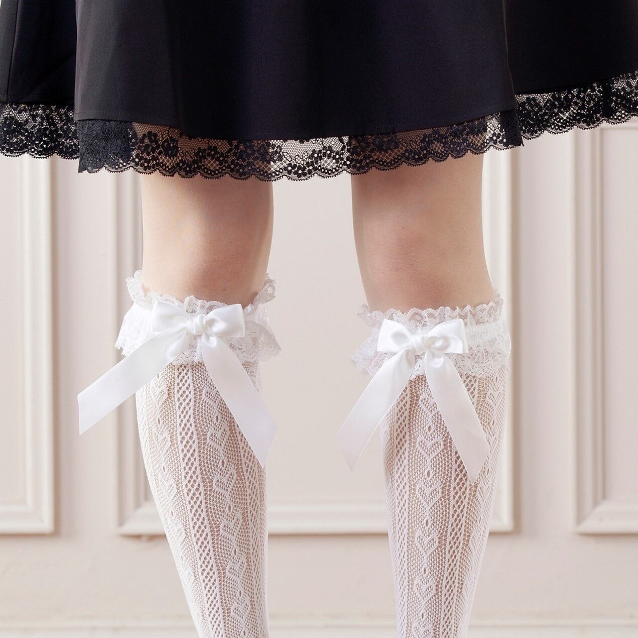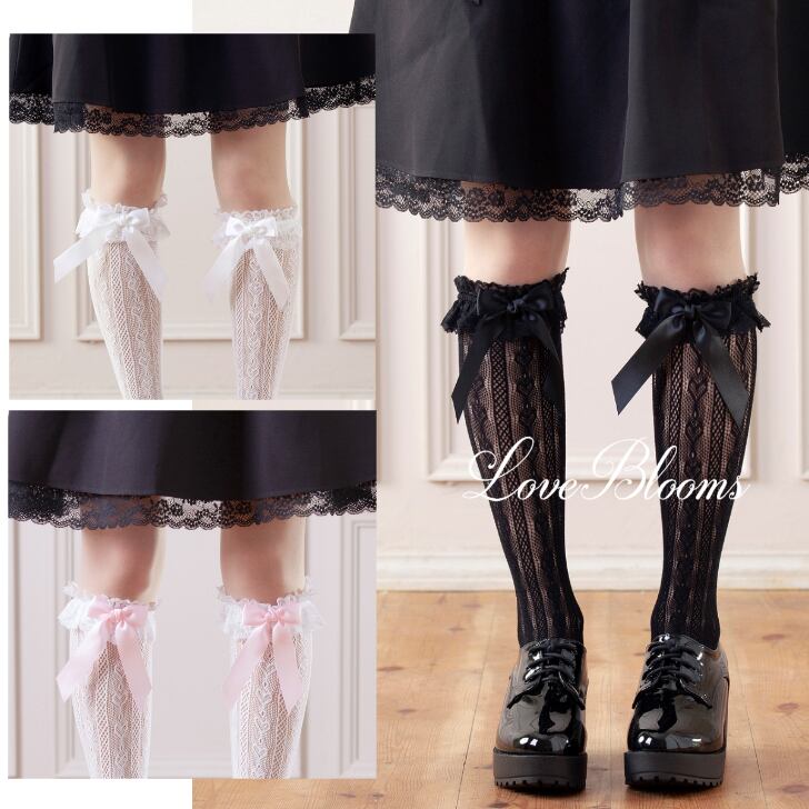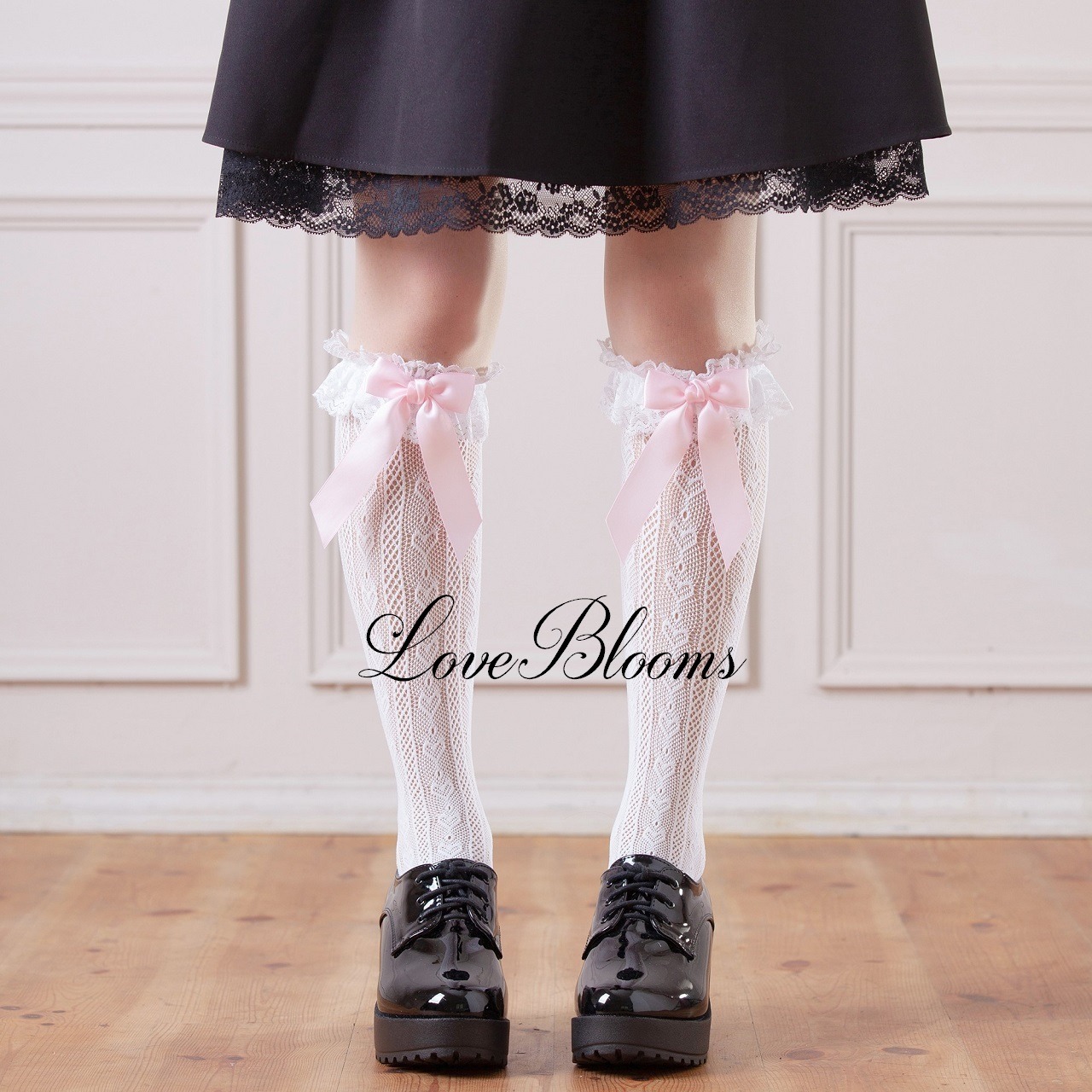 【送料無料】リボン付きハート柄レースフリルハイソックス レディース靴下 量産型 地雷系 ゆめかわいい ロリータ LB12002