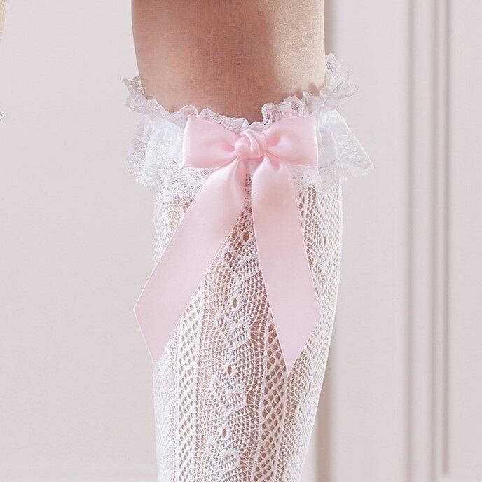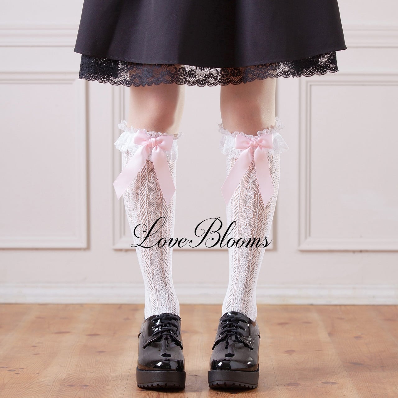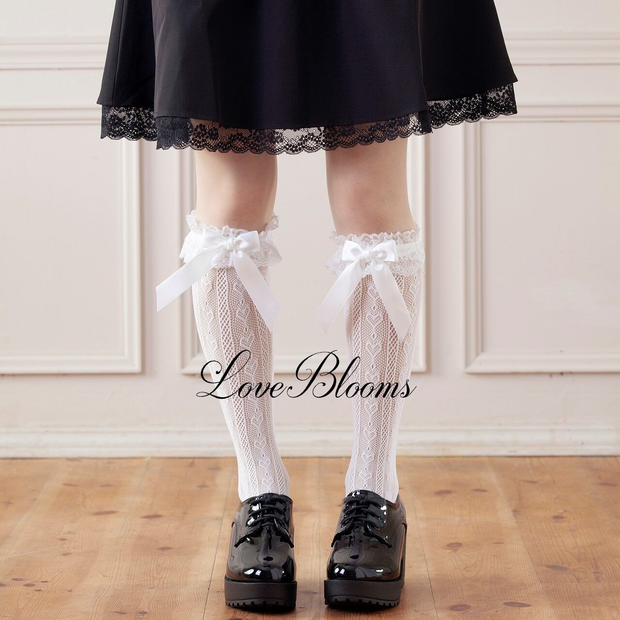 可愛さがたっぷり詰まったリボン付きのハート柄フリルレースハイソックスです。