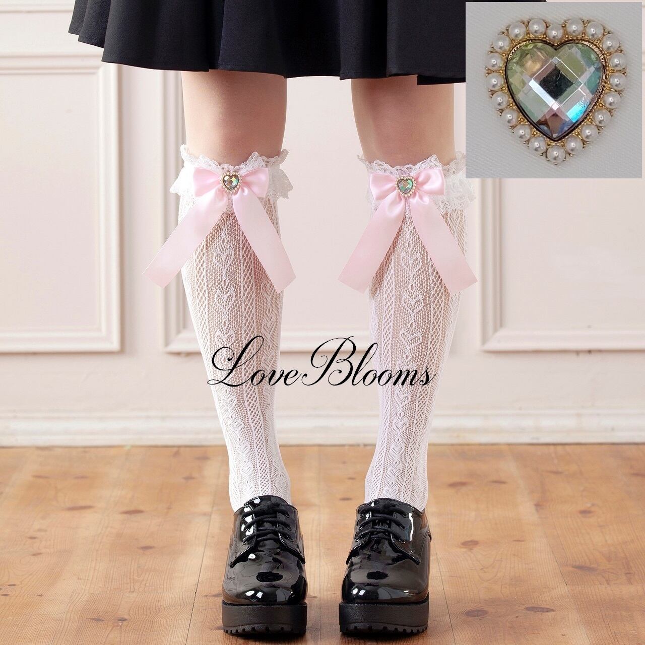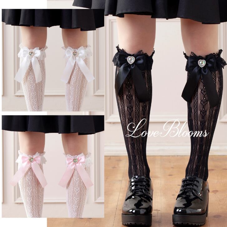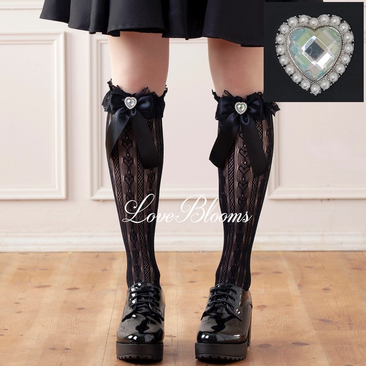 【送料無料】キラキラパールハートビジュー リボン付きハート柄レースフリルハイソックス レディース靴下 量産型 地雷系 ゆめかわいい ロリータ LB12017