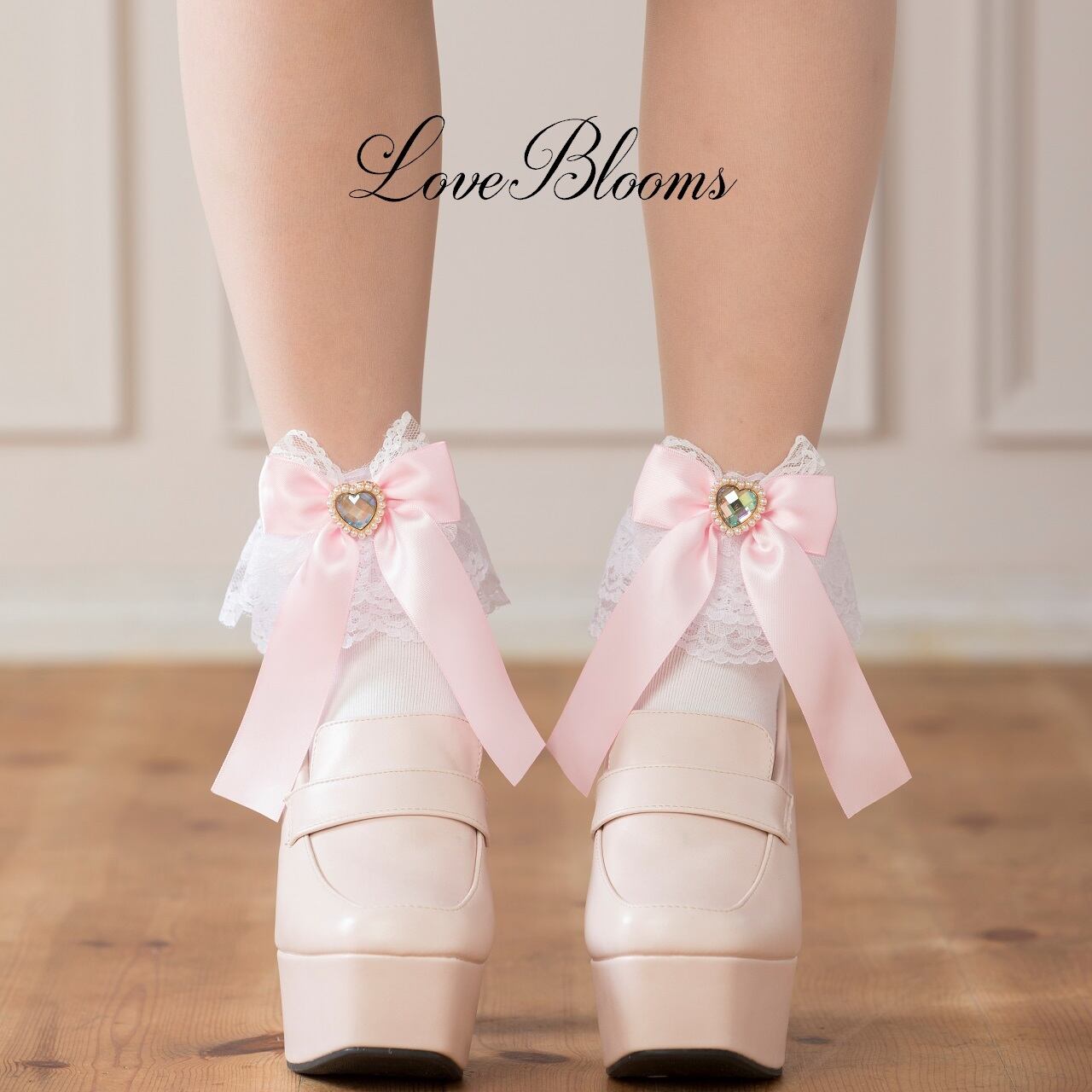 【送料無料】パール ハート ビジュー サテン リボン フリルレース ソックス 黒 白 ブラック ホワイト レディース 靴下 量産型 地雷系 ゆめかわいい 姫系 ゴスロリ ロリータ 厚底 厚底シューズ LB17058