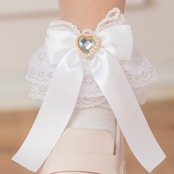 フリルレースにハートのビジューがついたリボンがトッピングされたデザインは、女の子らしさ溢れる仕上がり。