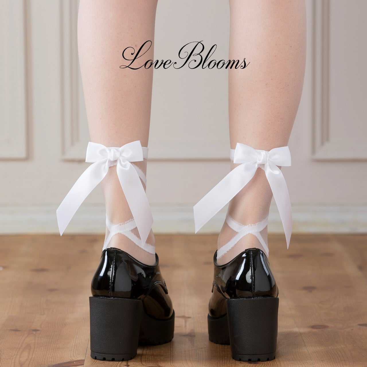 シースルーレースアップのデザインは、あなたの脚を細く美しく見せてくれます。また、後ろに付いたリボンが、愛らしさもプラスして、いつものコーデに履くだけで、足もとが映えること間違いなしです