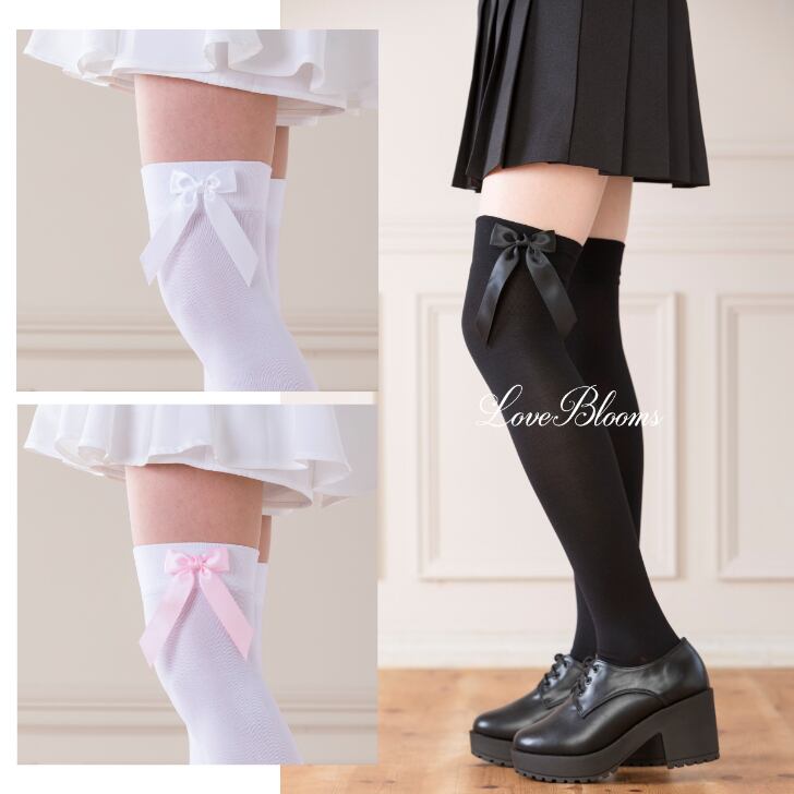 気になる口ゴム部分も肉盛りしにくく安心して履けるニーハイソックスに可愛いリボンが付いたアイテムです。
