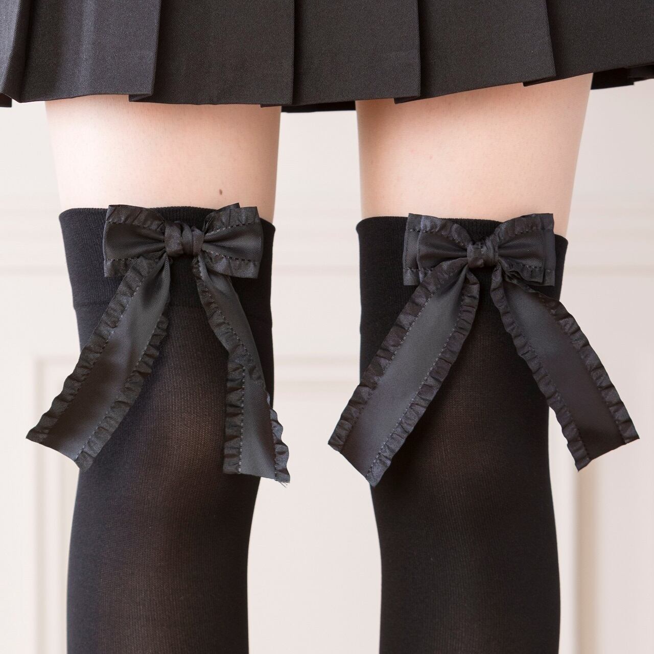 気になる口ゴム部分も肉盛りしにくく安心して履けるニーハイソックスに可愛いリボンが付いたアイテムです。