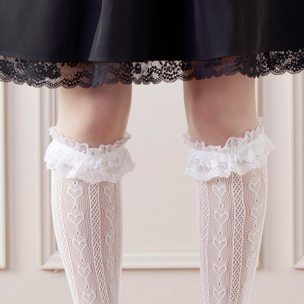 華やかなレースフリルとかわいらしいハート柄が魅力的な、フェミニンでキュートなハイソックス。
