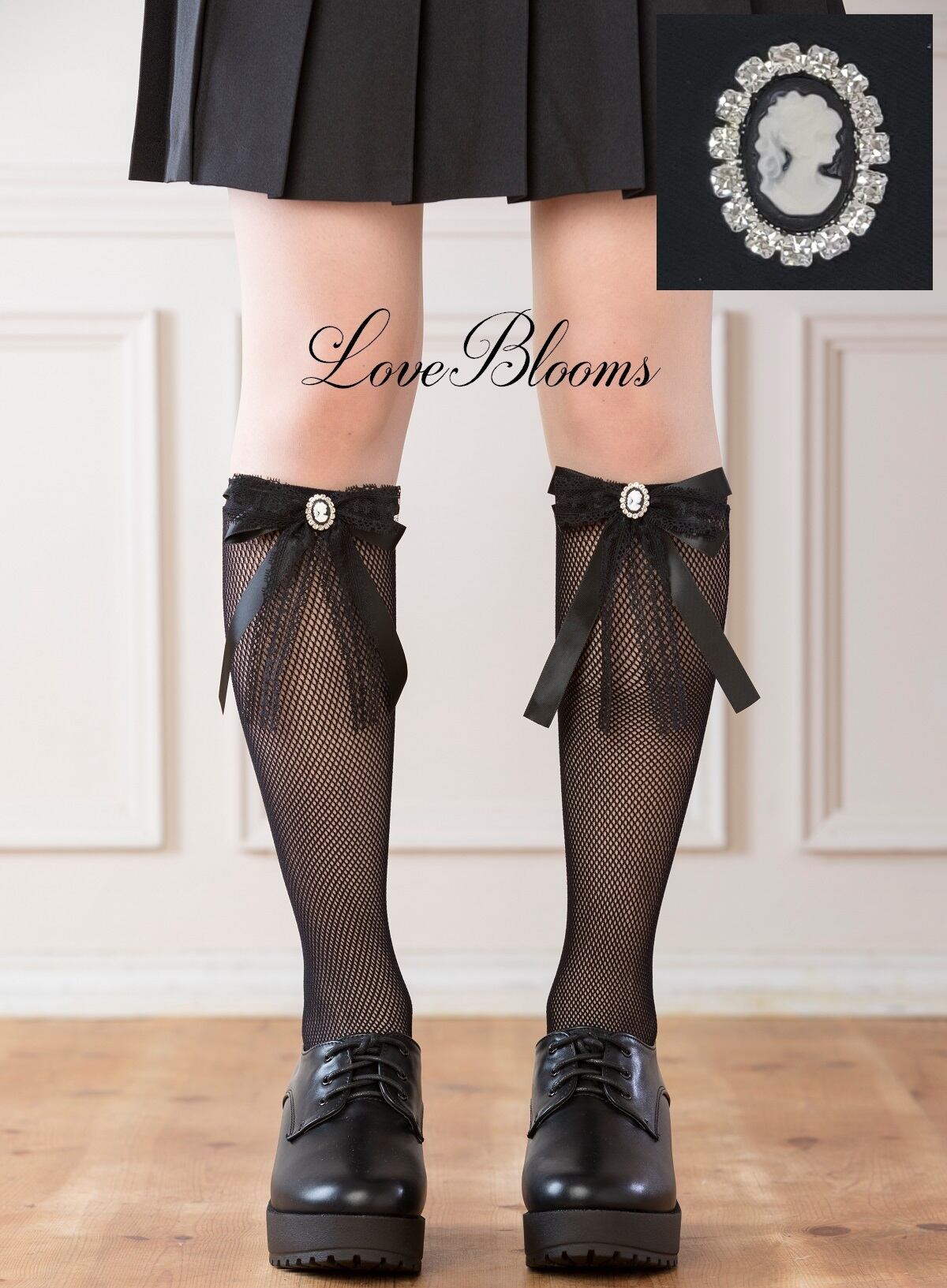【送料無料】カメオ レース サテン リボン 網ハイソックス 黒 ブラック レディース 靴下 量産型 地雷系 ゆめかわいい 姫系 ゴスロリ ロリータ 厚底 厚底シューズ LB18017