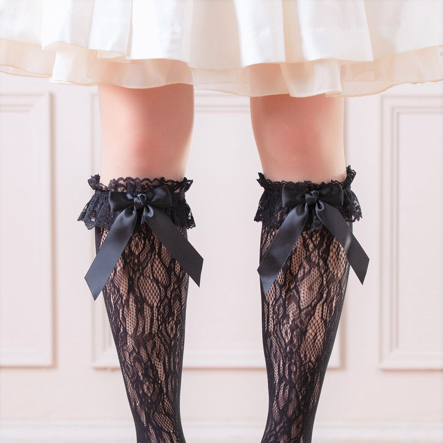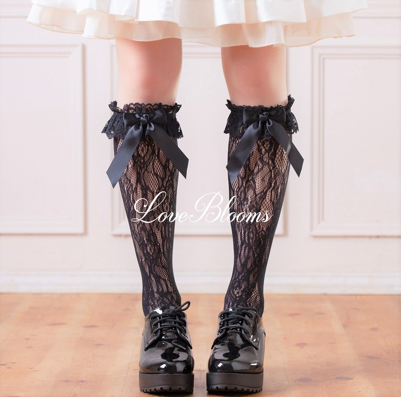 可愛らしいデザインのリボン付きフリルレースハイソックスは足元を華やかに演出してくれるアイテムです。