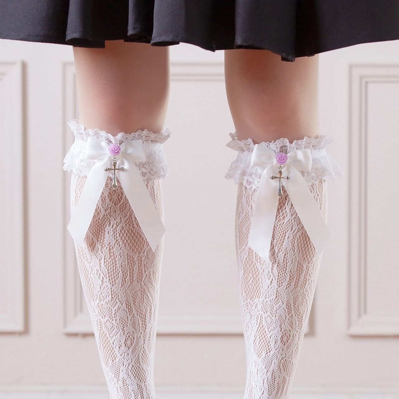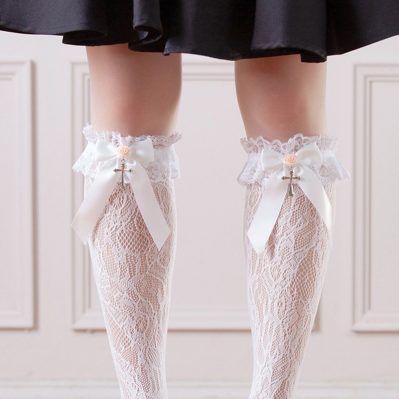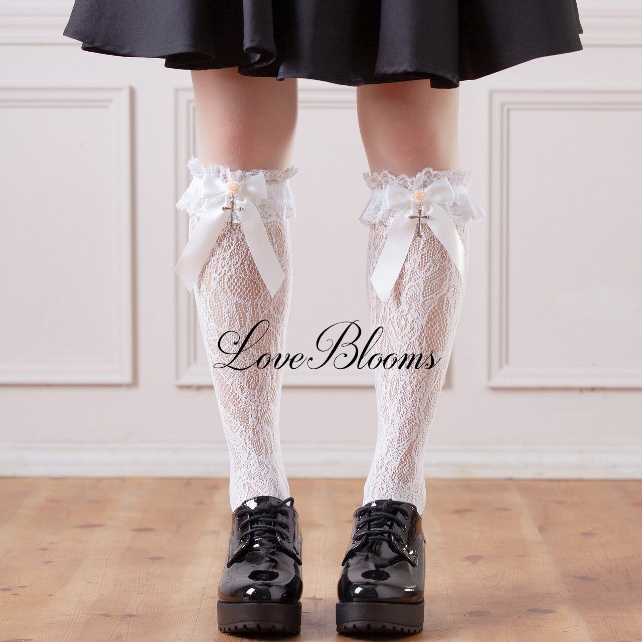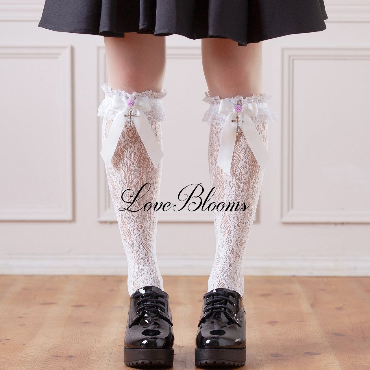 【送料無料】薔薇クロスチャーム サテンリボン付き フリルレース ハイソックス レディース靴下 量産型 地雷系 ゆめかわいい ロリータ LB12206