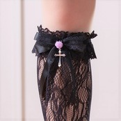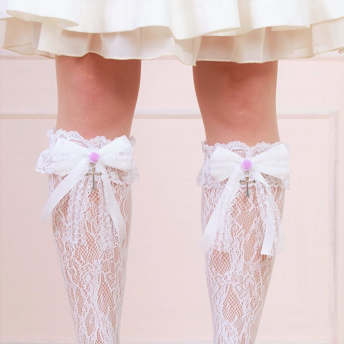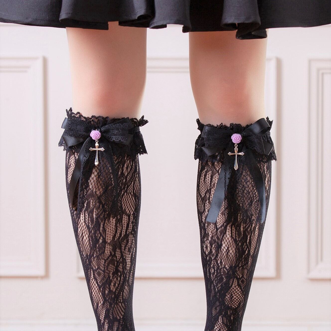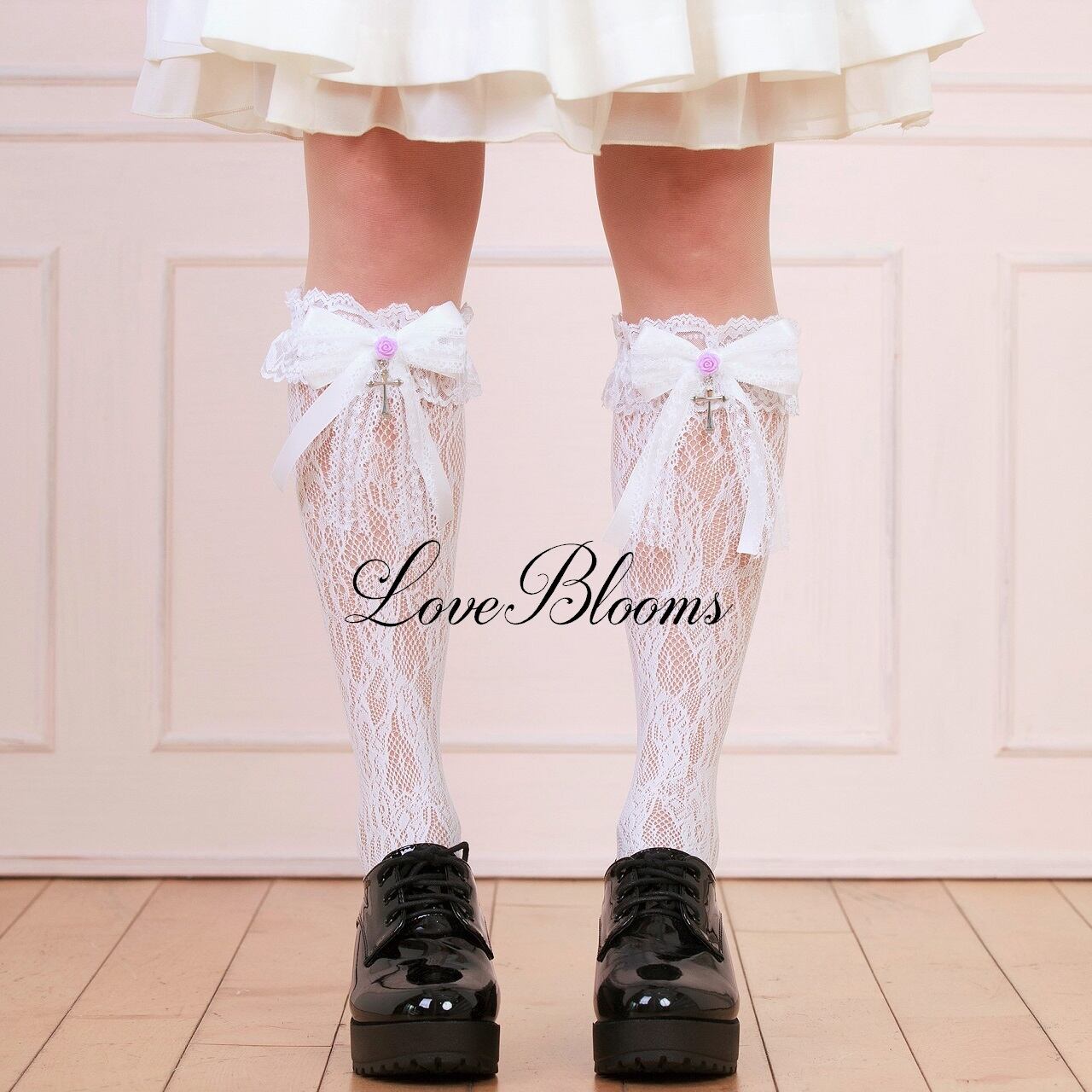 【送料無料】薔薇クロスチャーム レースリボン付き フリルレース ハイソックス レディース靴下 量産型 地雷系 ロリータ LB12208