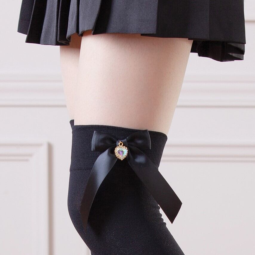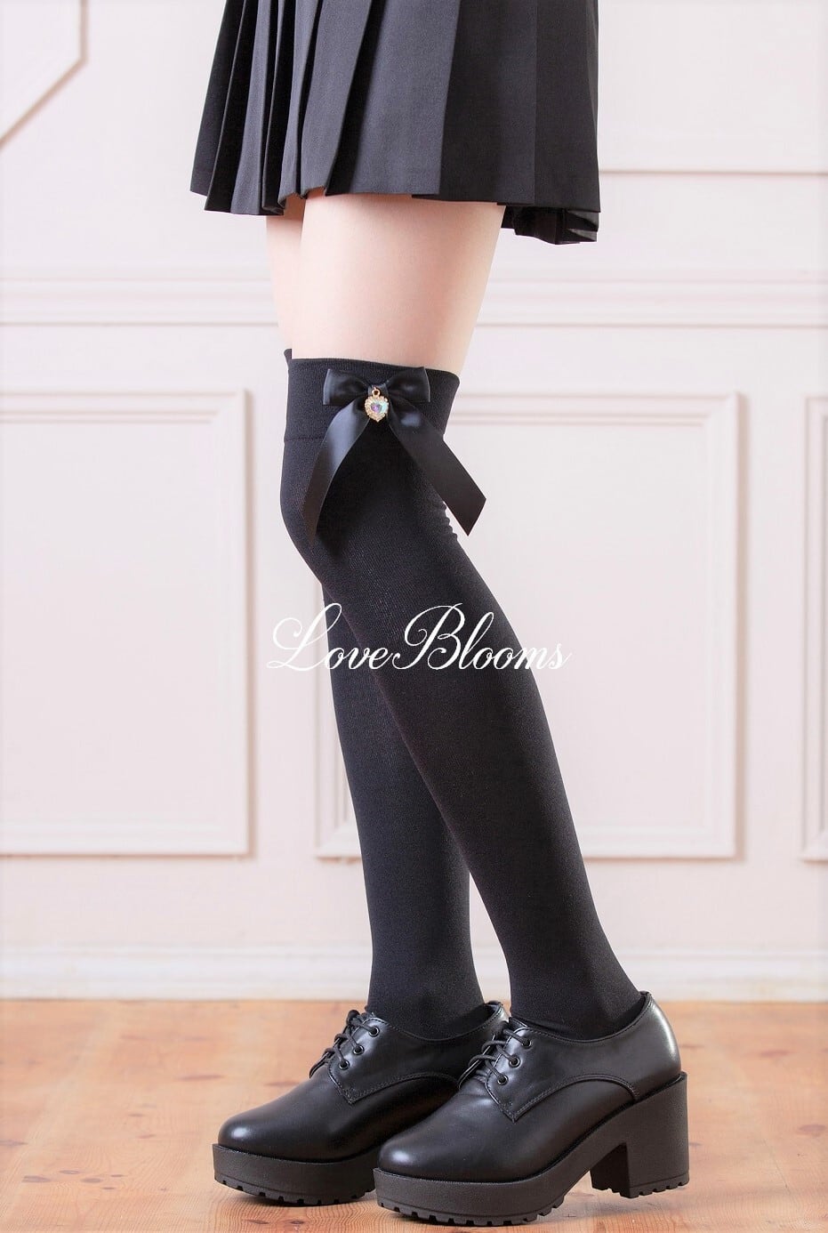 【送料無料】キラキラハートチャームリボン付き ニーハイソックス (ブラック ホワイト 黒 白)(23-25cm) オーバーニー ニーソ ニーソックス 靴下 レディース コスプレ LB19018
