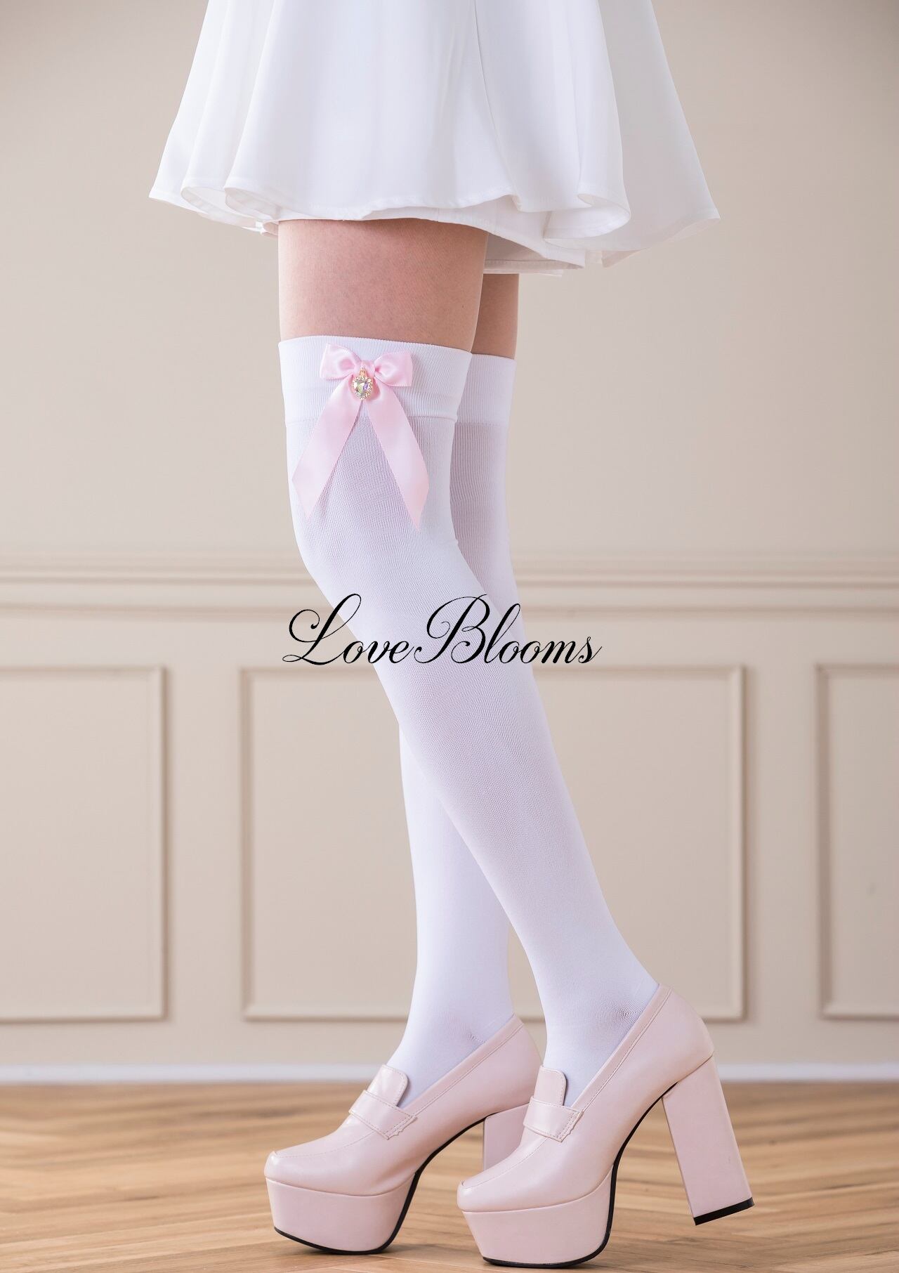 気になる口ゴム部分も肉盛りしにくく安心して履けるニーハイソックスに可愛いリボンが付いたアイテムです。