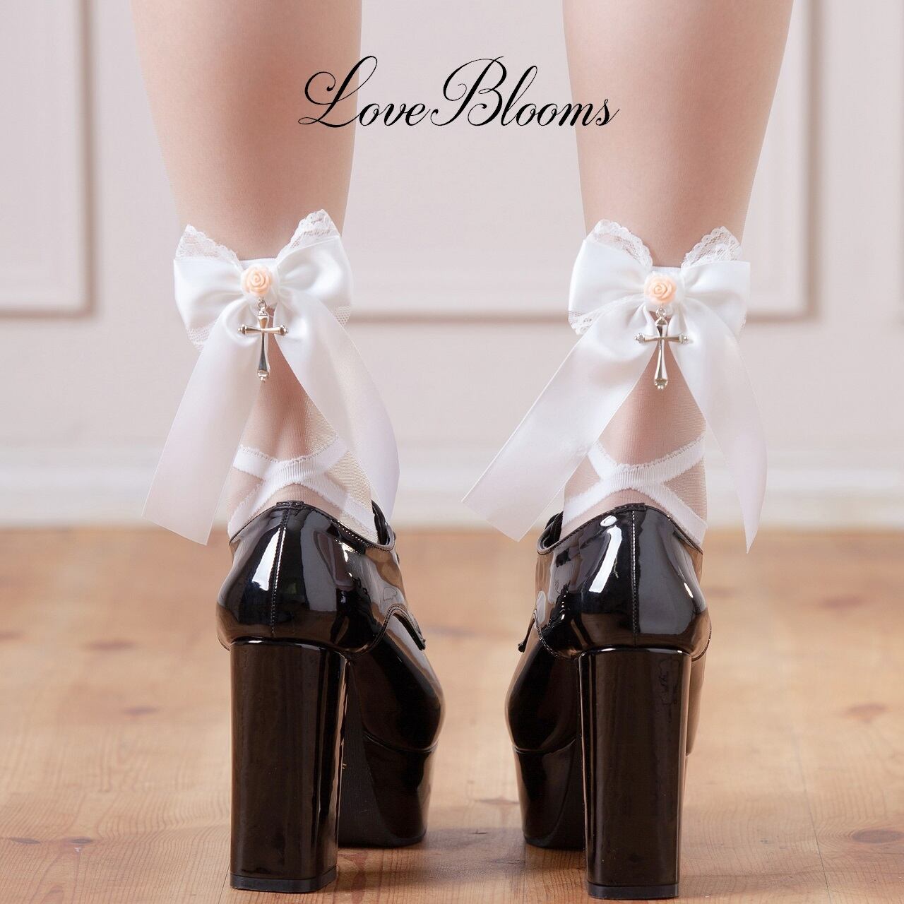 【送料無料】薔薇クロスチャーム サテンレースリボン付き シースルーレースアップ ソックス(日本製)レディース靴下 量産型 地雷系 ゆめかわいい ロリータ LB17101