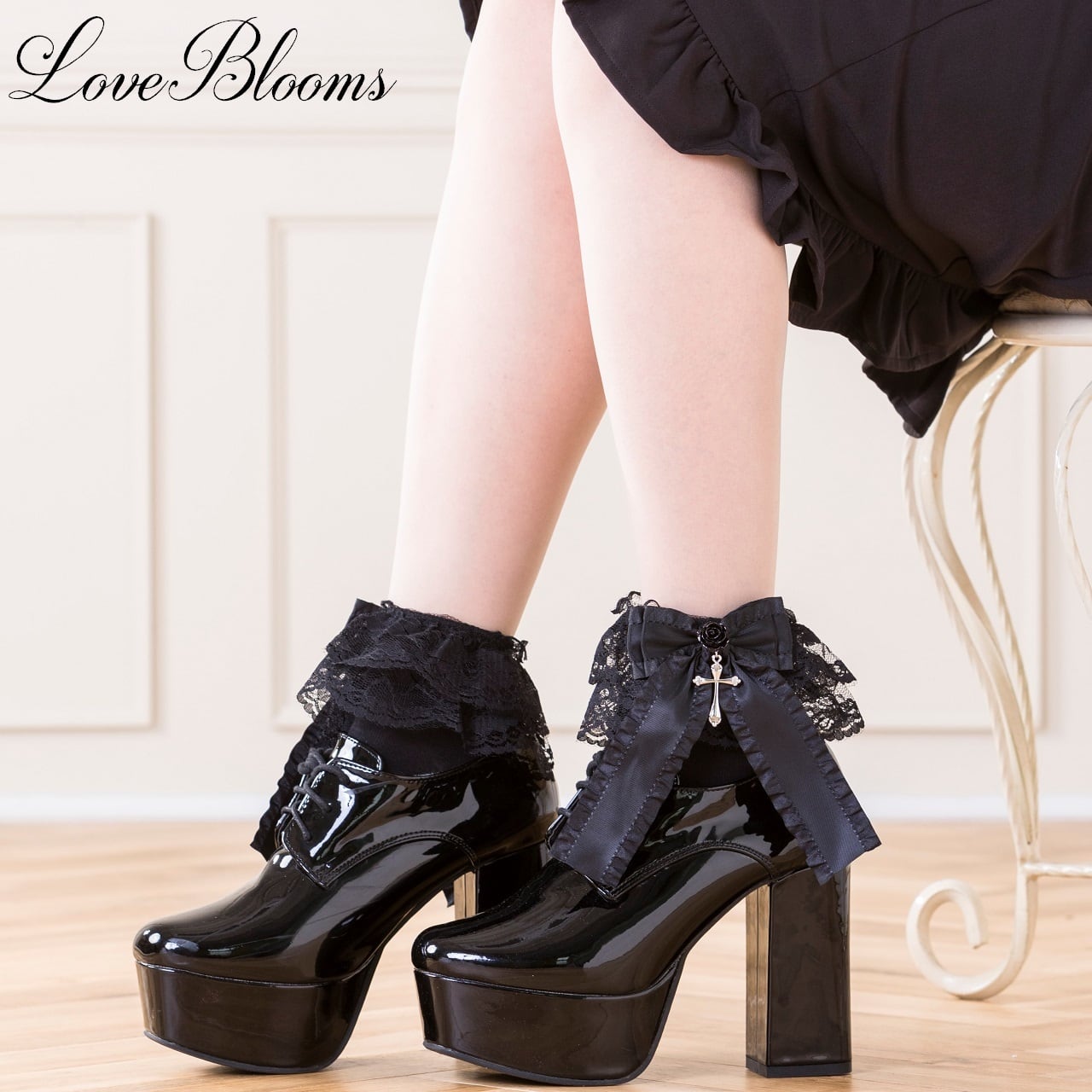 エレガントでかわいらしい薔薇クロスチャームがついた、リボンフリルレースソックスです。