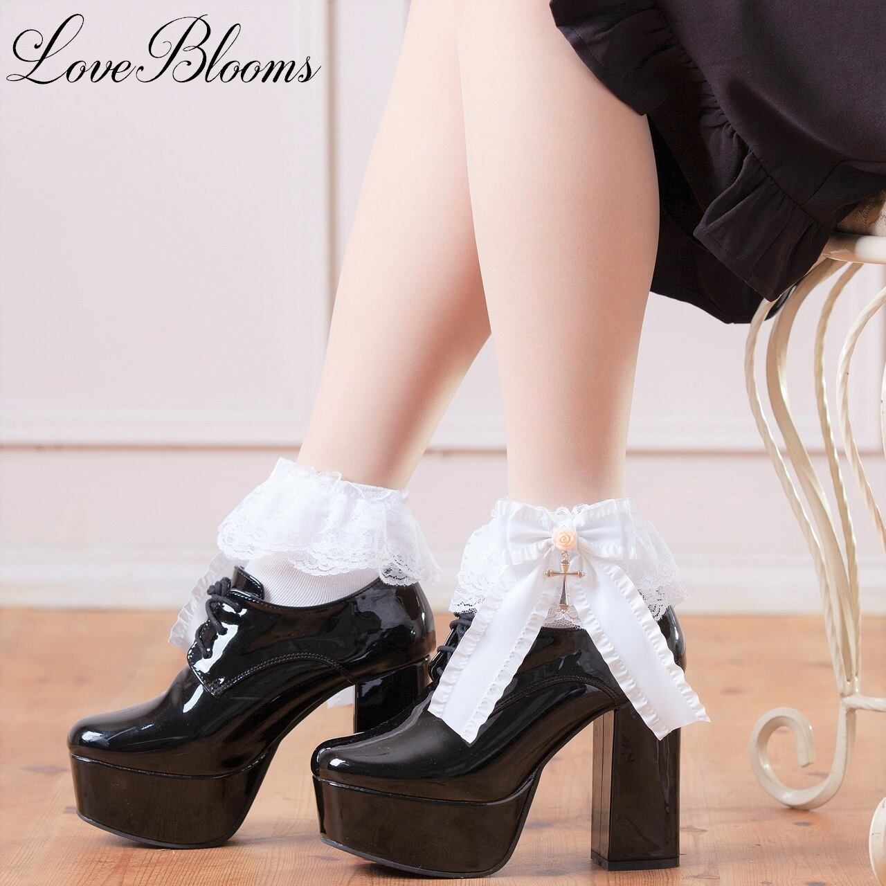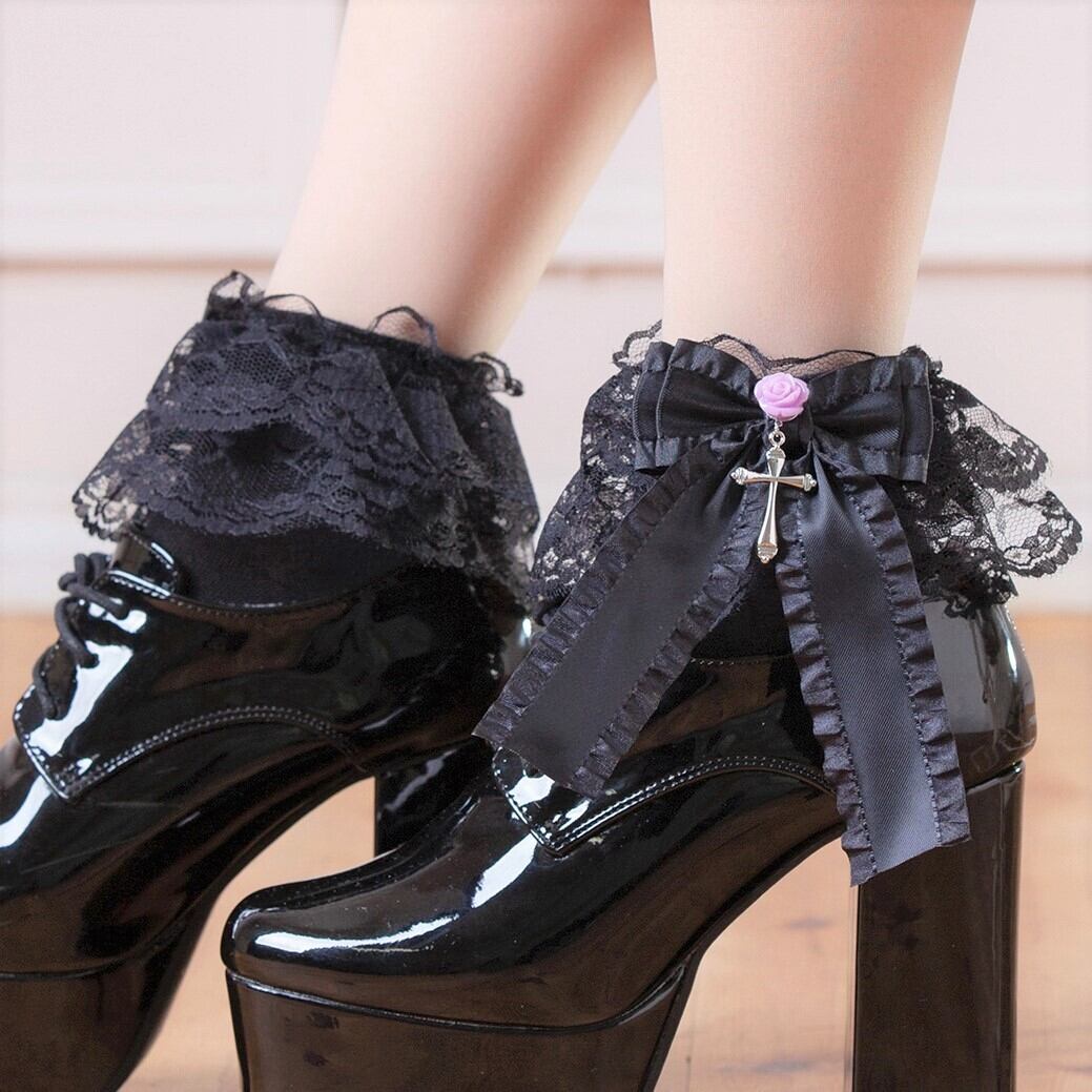 【送料無料】薔薇クロスチャーム サテンフリルリボン付き フリルレースソックス レディース靴下 量産型 地雷系 ゆめかわいい ロリータ LB17103