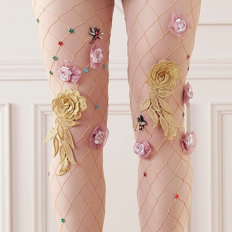 【Mermaid tights】デザインタイツ ベージュ カラフル花・飾り付き網タイツ ストッキング レディースタイツ LB36609