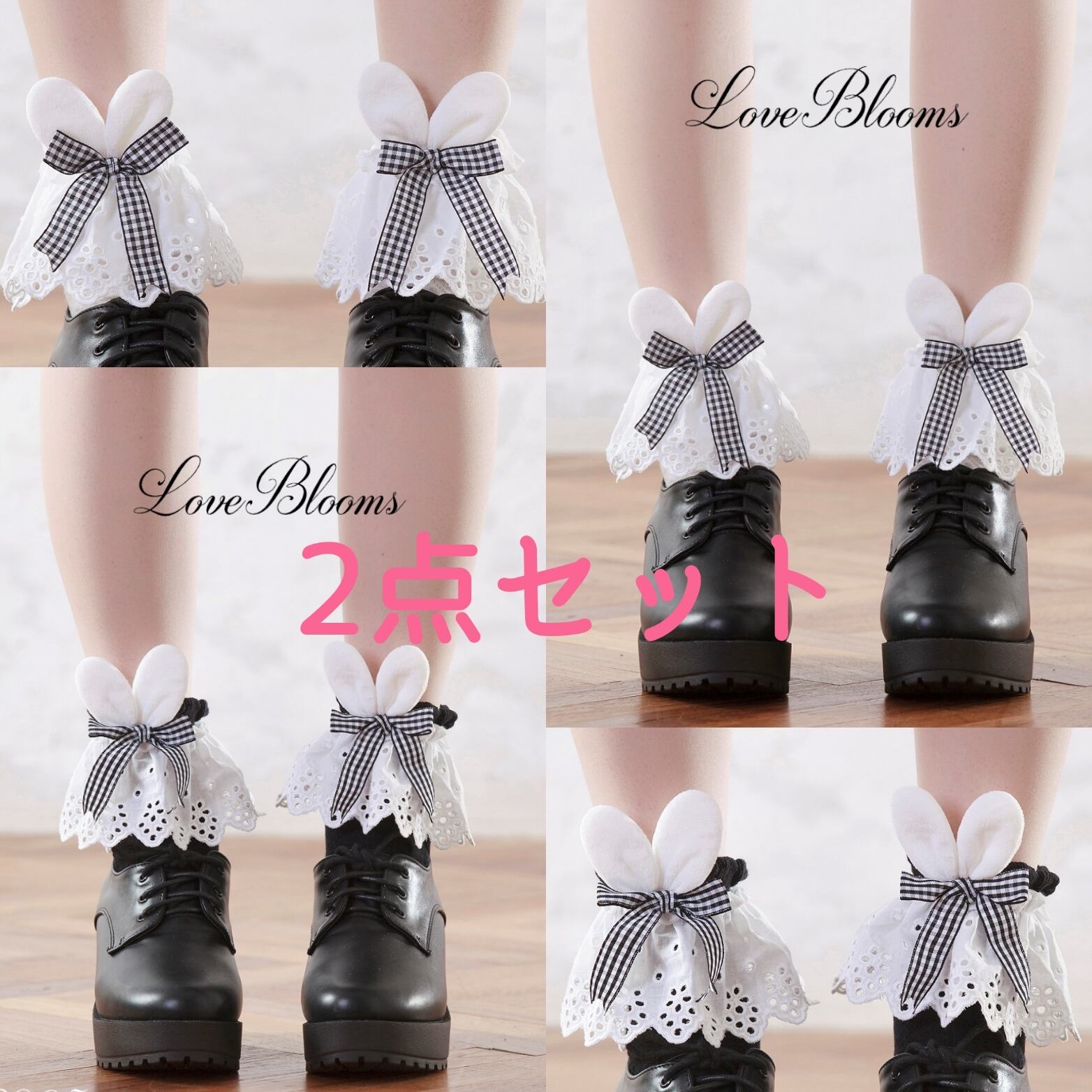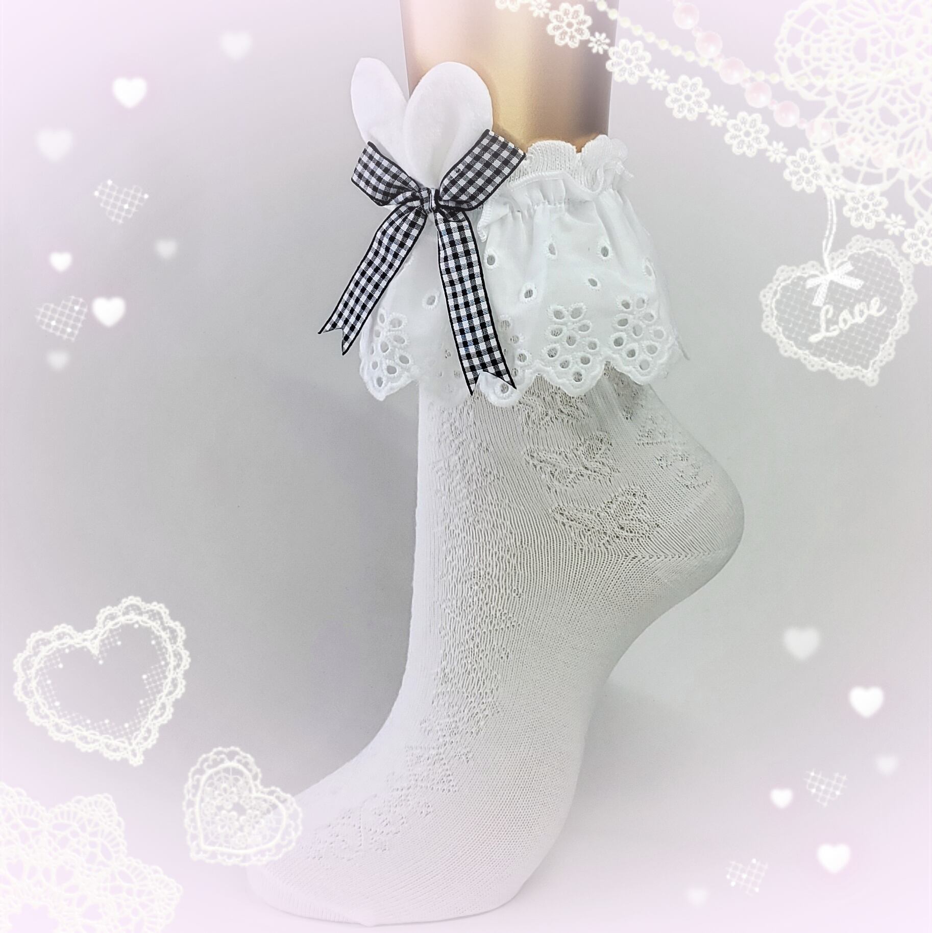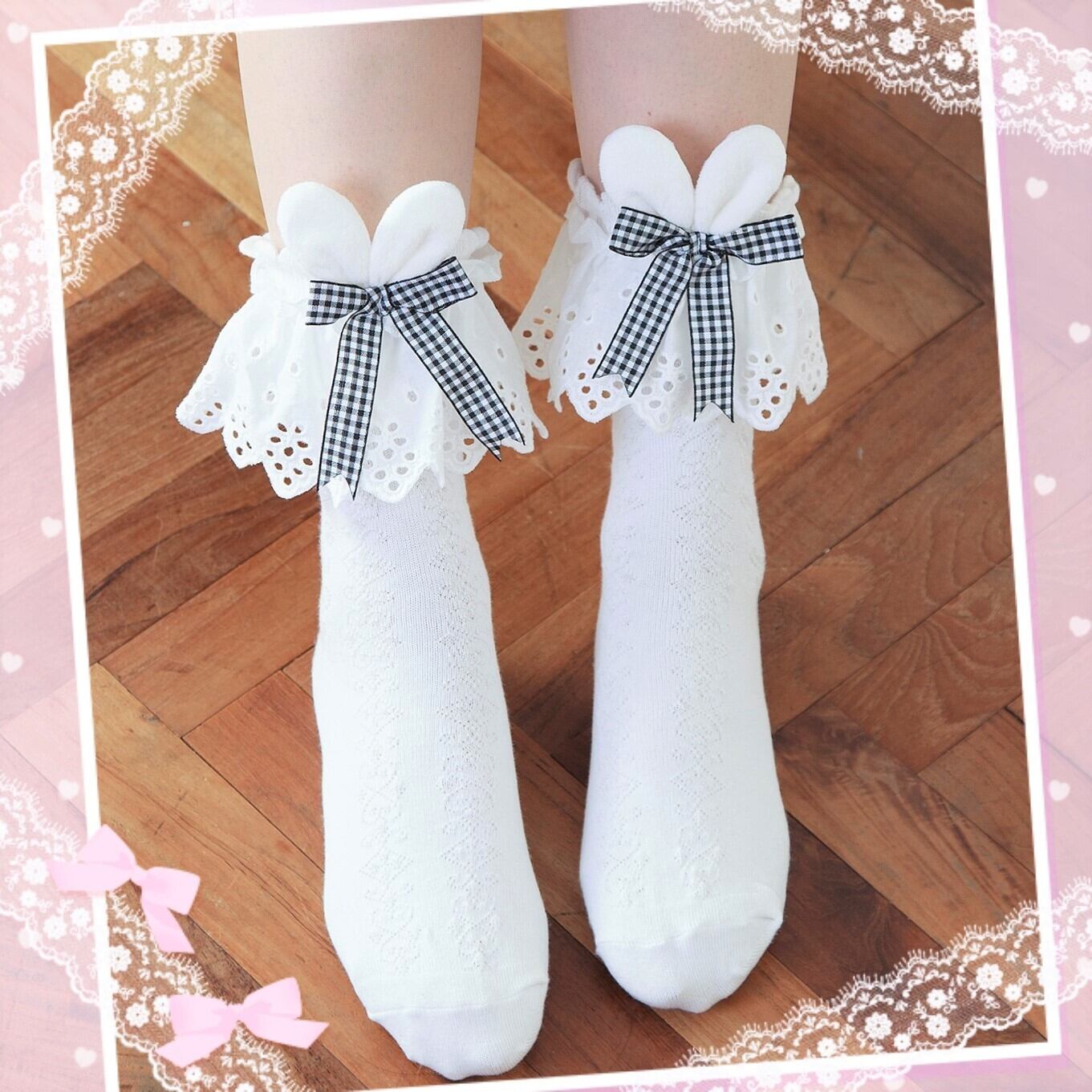 【送料無料】2点セット うさ耳リボン フリルレース ソックス 黒 白 レディース靴下 量産型 地雷系 ロリータ LB32905-1