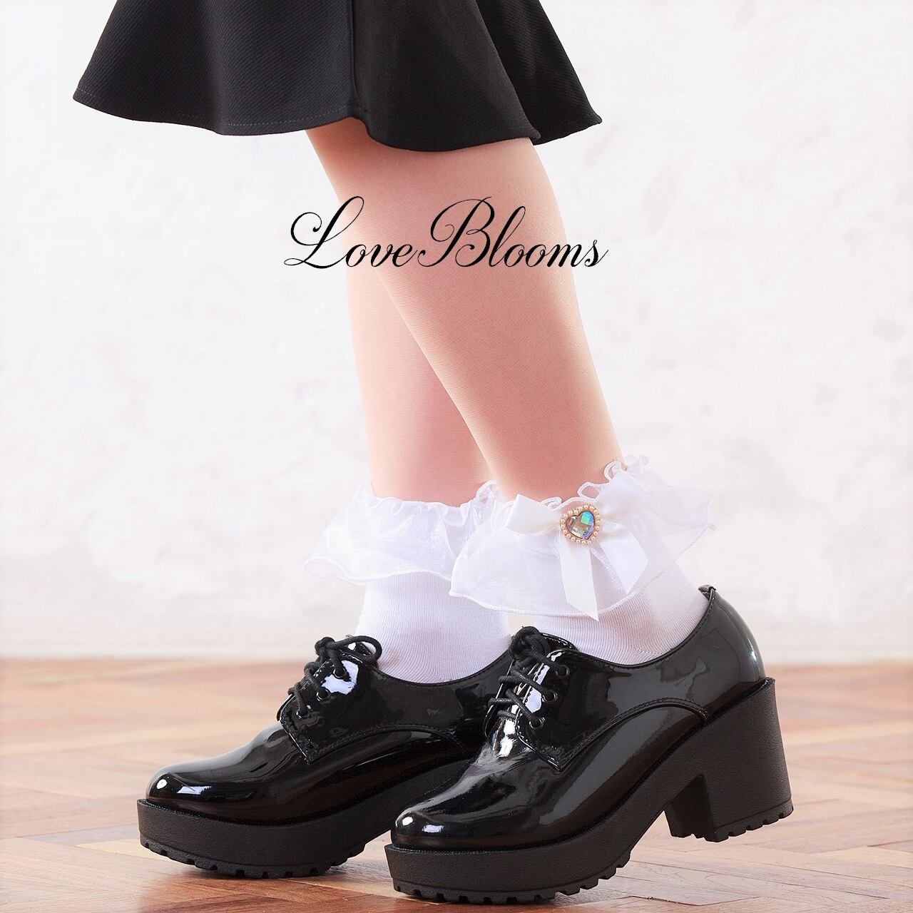 【送料無料】ハートビジュー リボン付き フリルチュール ショートソックス 黒 白 レディース靴下 量産型 地雷系 ゆめかわいい LB12914