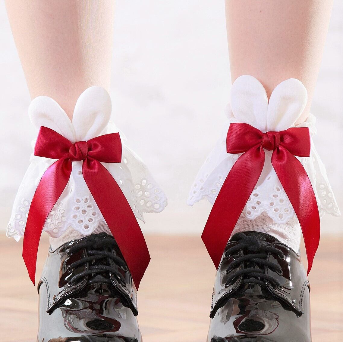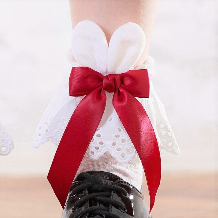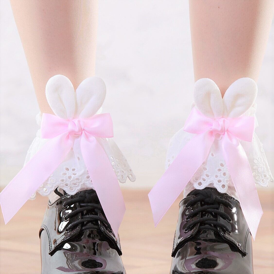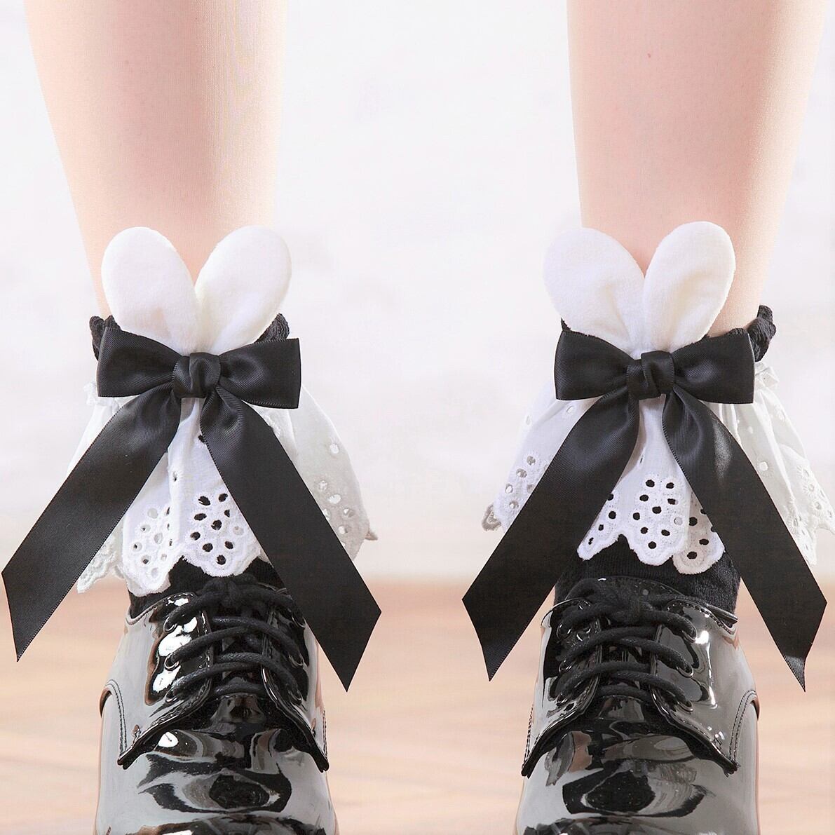 【送料無料】うさ耳リボン フリルレース ソックス 黒 白 レディース靴下 量産型 地雷系 ゆめかわいい LB12907