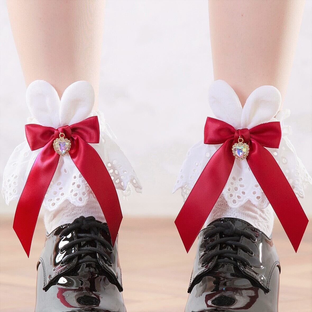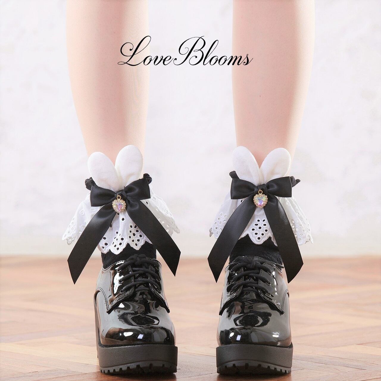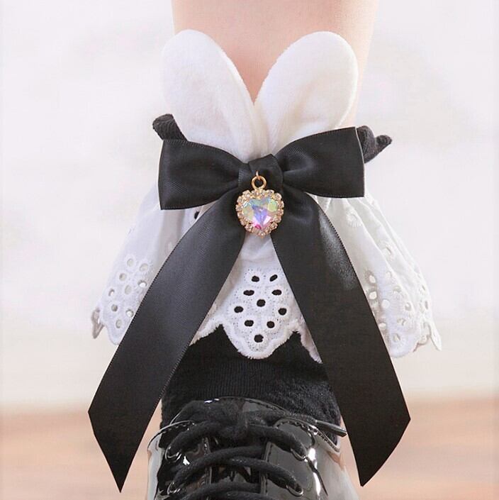 【送料無料】うさ耳リボン フリルレース ソックス 黒 白 レディース靴下 量産型 地雷系 ゆめかわいい LB12908