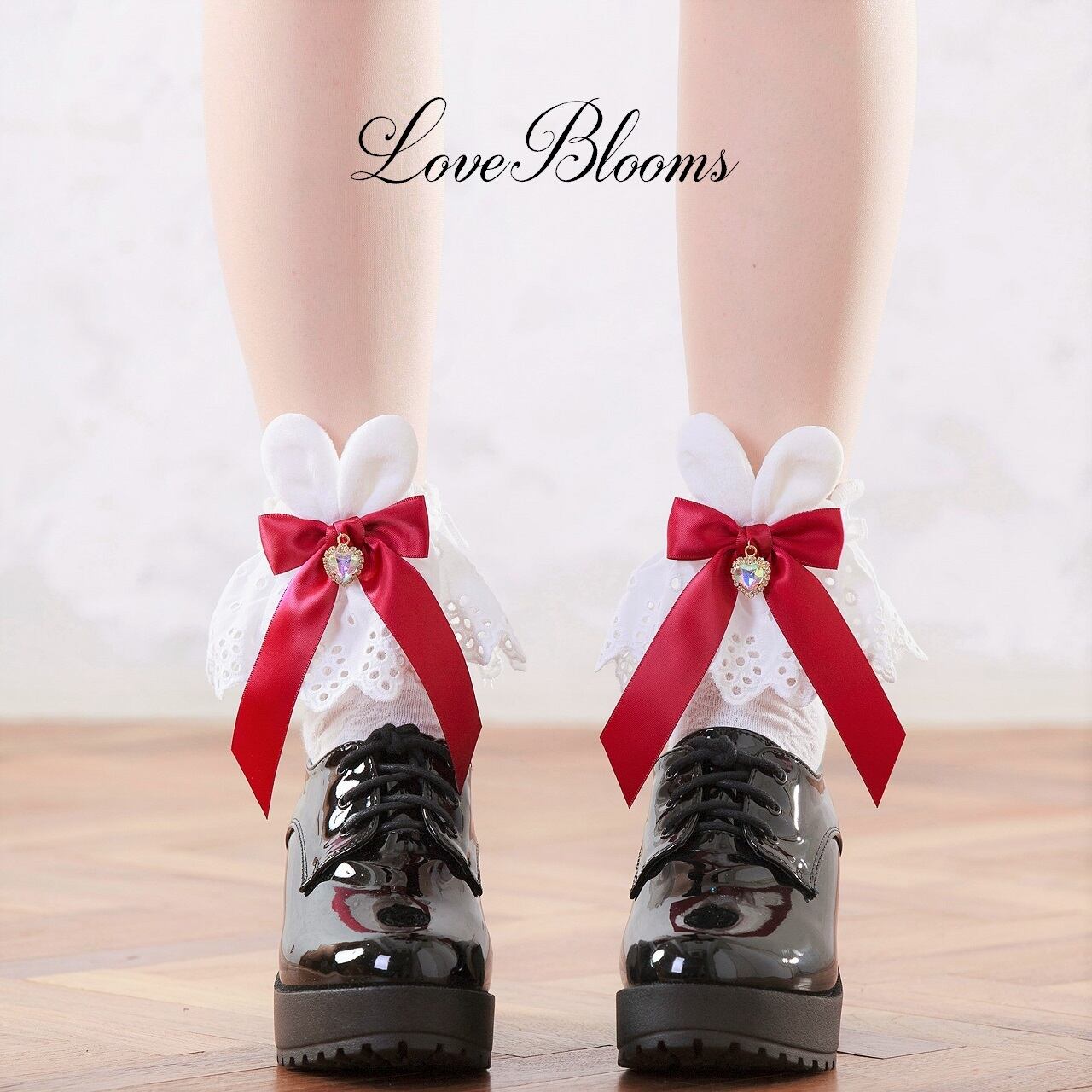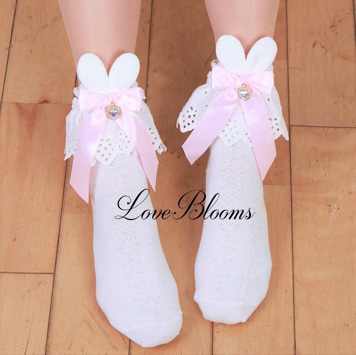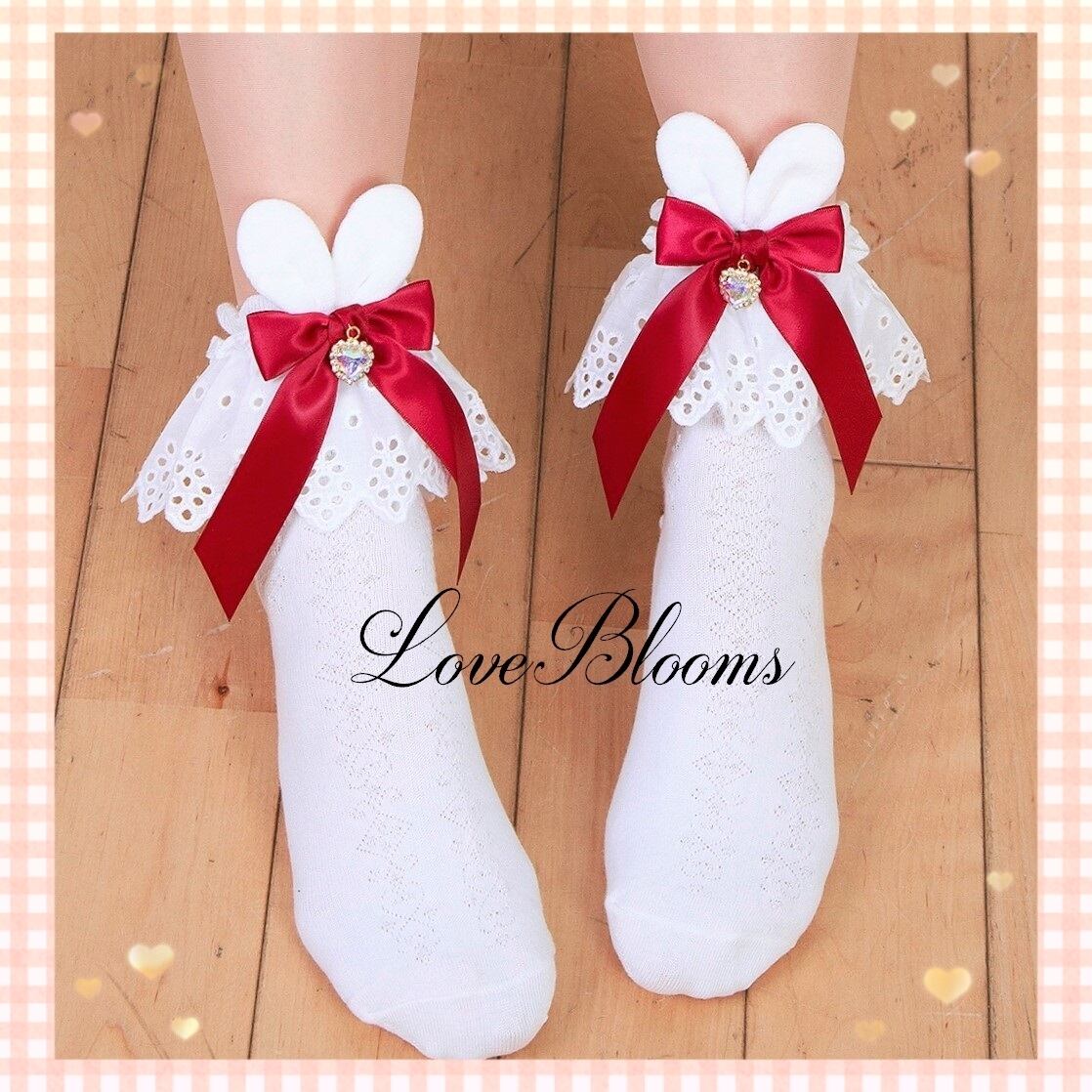 【送料無料】うさ耳リボン フリルレース ソックス 黒 白 レディース靴下 量産型 地雷系 ゆめかわいい LB12908