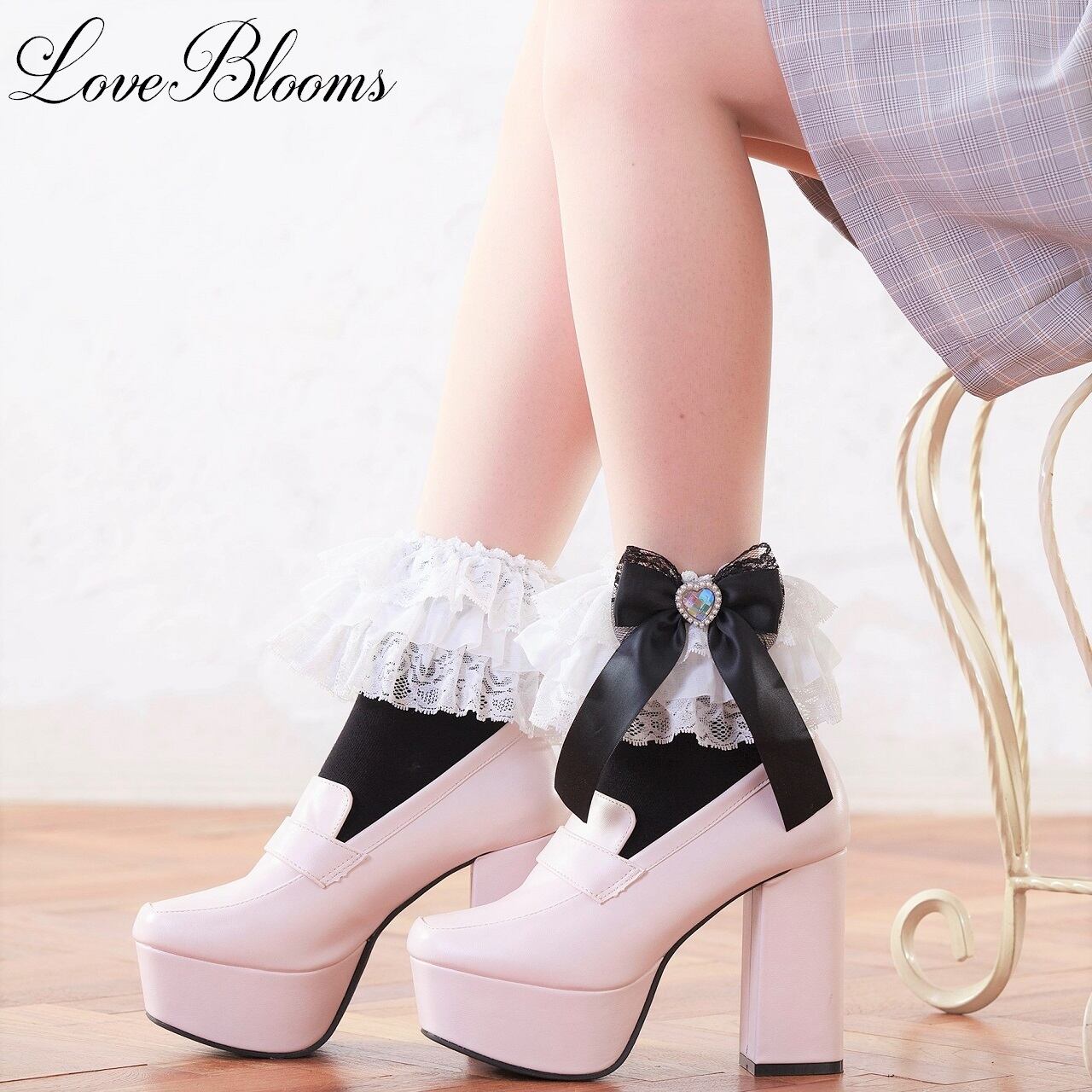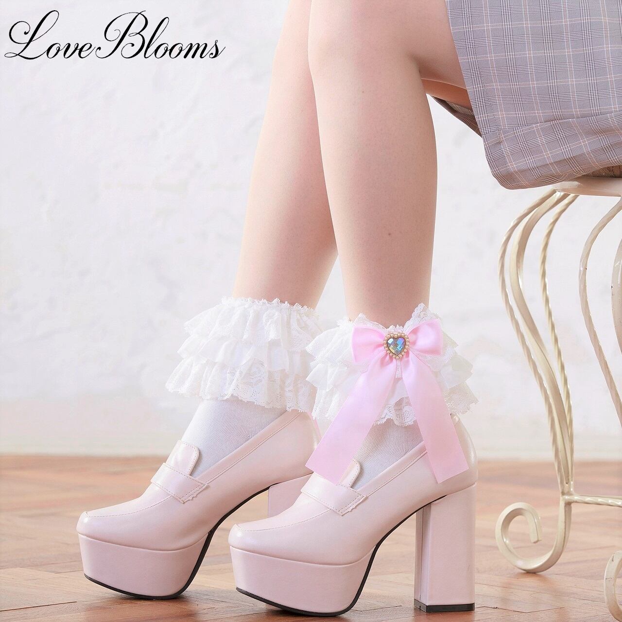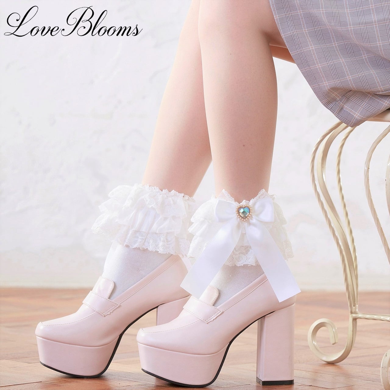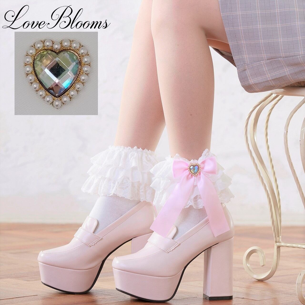 3段のフリルレースが足首を可愛く包み込み、ハート型のビジューモチーフと可愛らしいリボンがアクセントになり、足元を一層華やかに演出します。