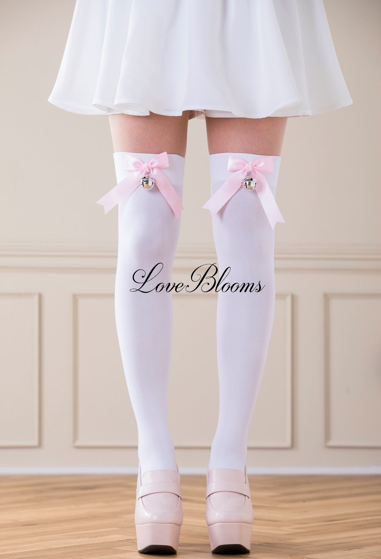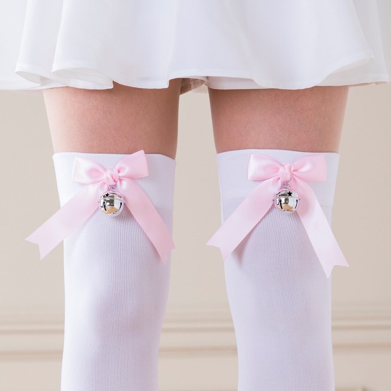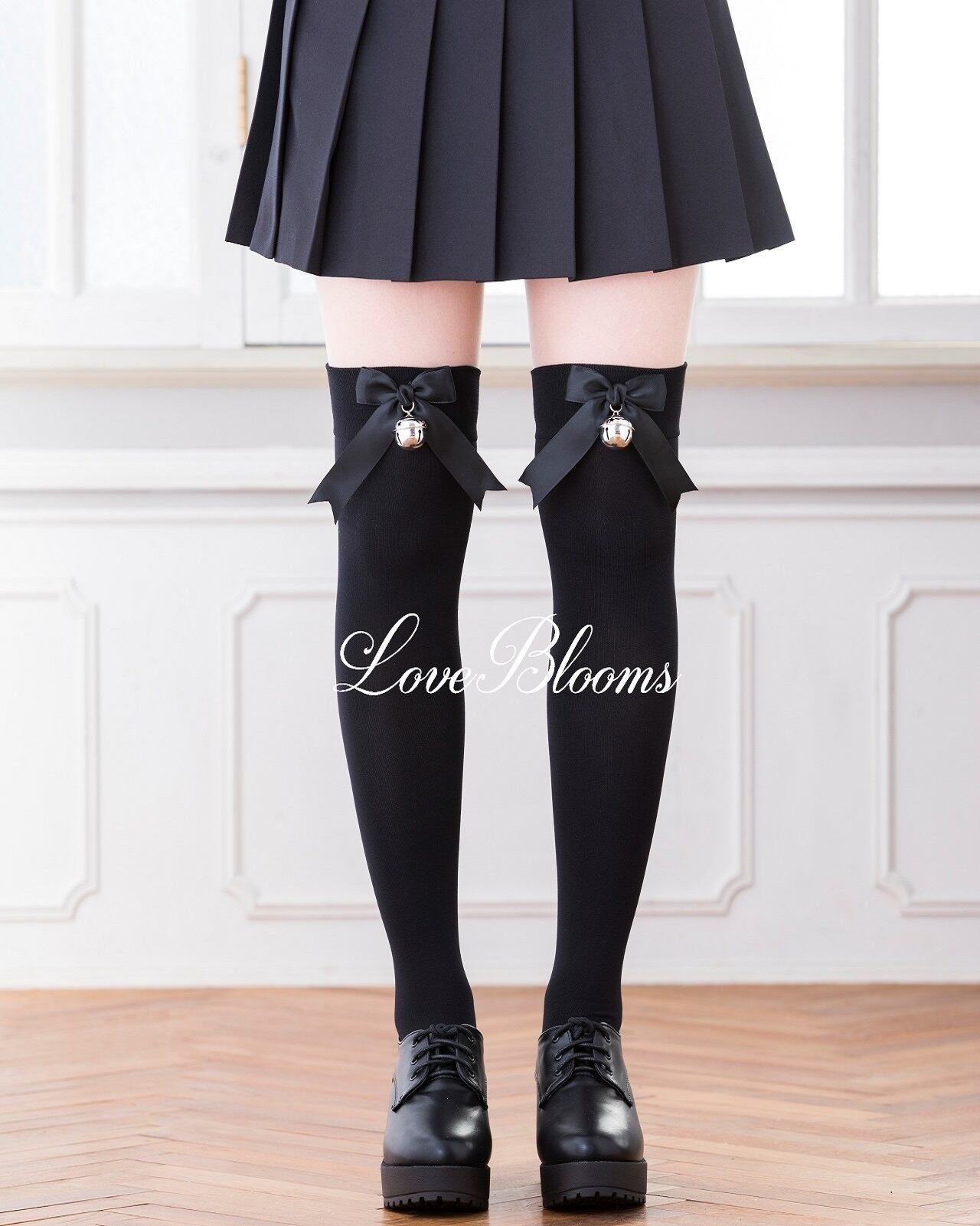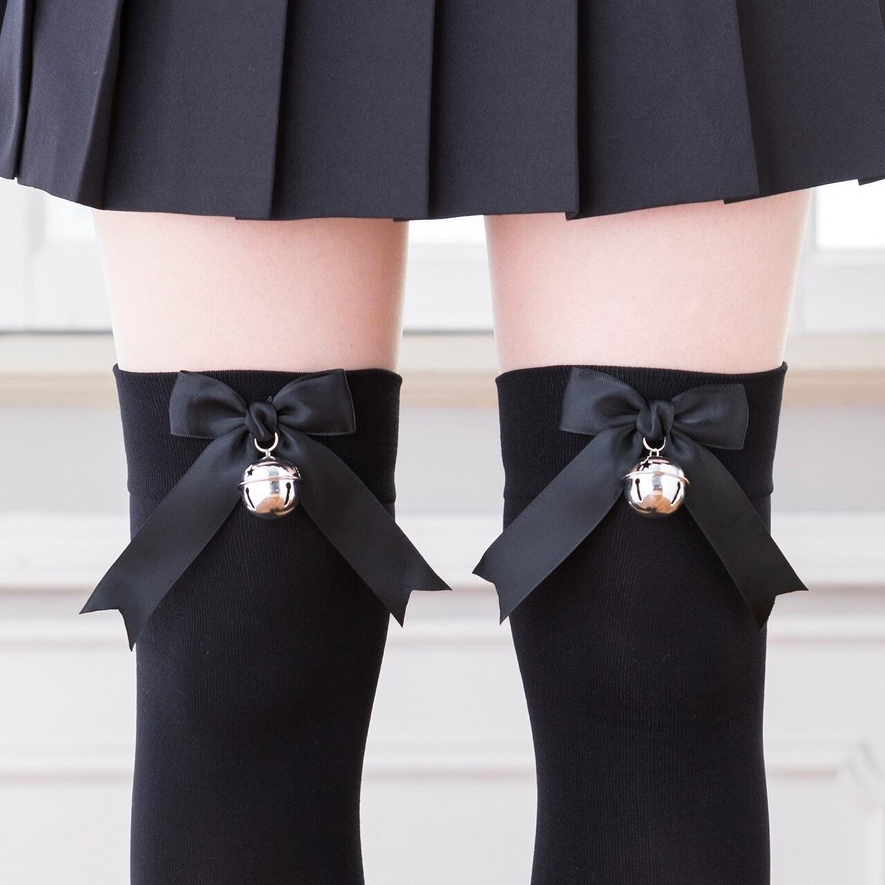 【送料無料】鈴 リボン付き ニーハイソックス (ブラック ホワイト 黒 白)(23-25cm) オーバーニー ニーソ ニーソックス 靴下 レディース コスプレ LB19020