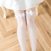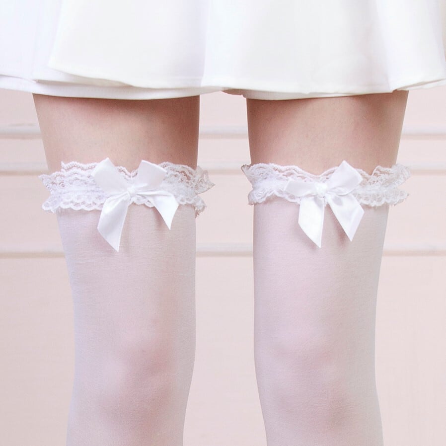 エレガントなフリルレースと可愛らしいリボンが魅力のシアーニーハイソックス。