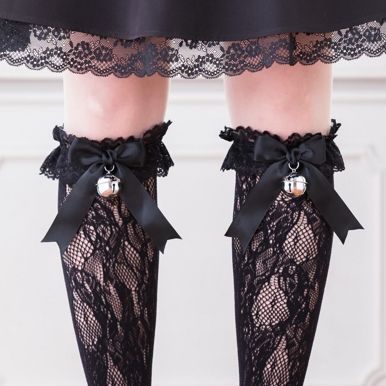 【送料無料】鈴 リボンフリルレース ハイソックス 黒 白 レディース 靴下 量産型 地雷系 ロリータ LB12215