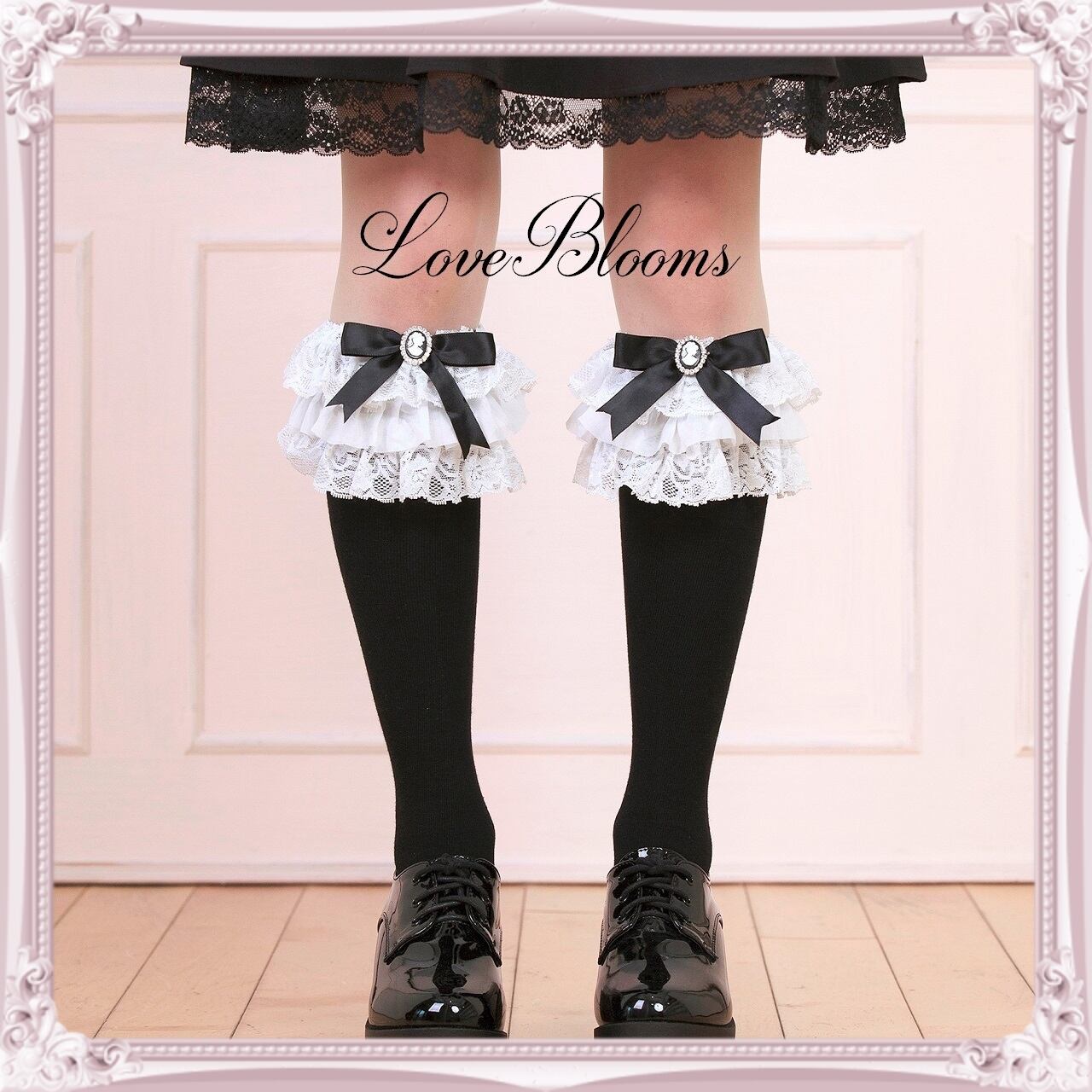 【送料無料】カメオ リボン 3段 フリルレース ハイソックス 黒 白 レディース 靴下 ロリータ 量産型 地雷系 ロリータ LB12919