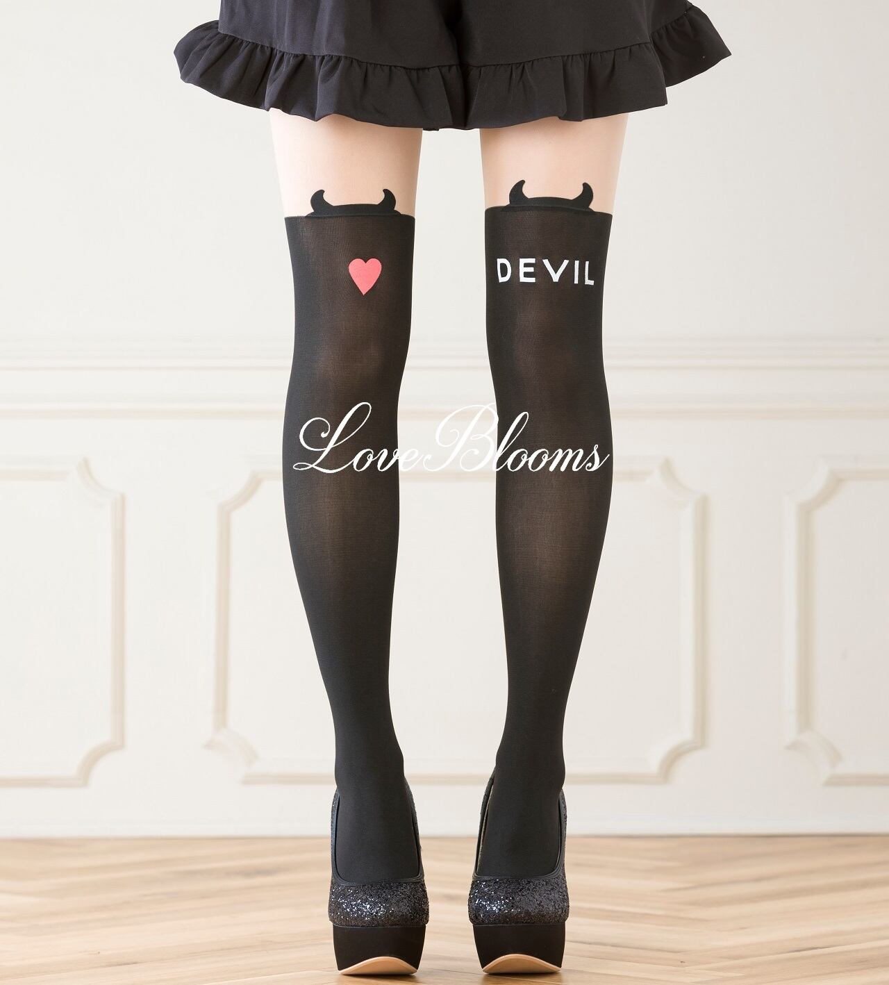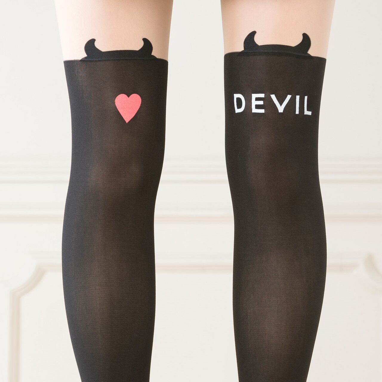 【送料無料】フェイクニーハイ ストッキング 黒 ブラック デビル柄 レディース タイツ 美脚 ニーハイ 量産型 地雷系 LB39910