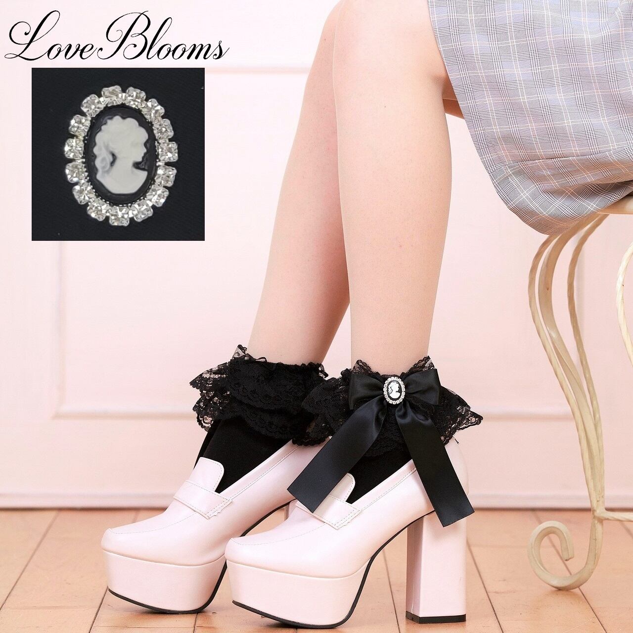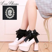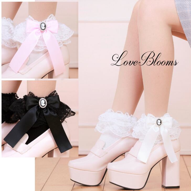 【送料無料】カメオ リボン フリルレース ソックス 黒 白 レディース 靴下 量産型 地雷系 ロリータ LB17110