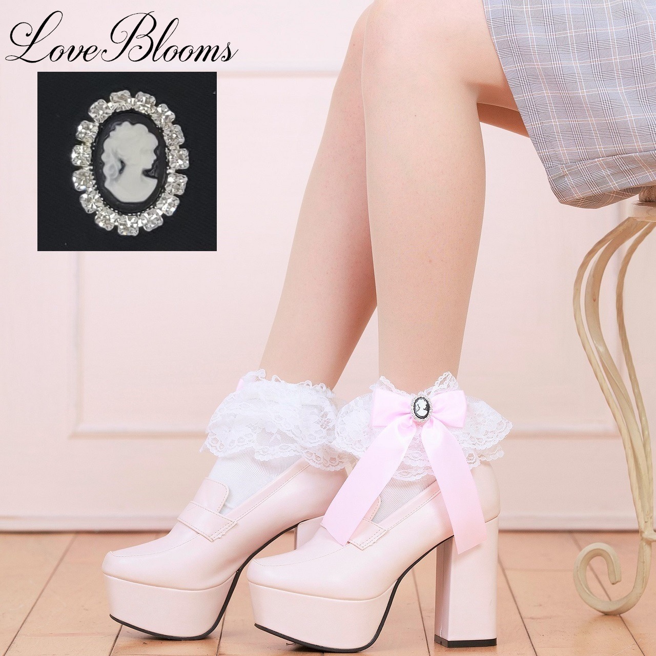 足元を彩るフリルレースには、上品なカメオリボンがアクセント。足元から愛らしさと品格を演出します。