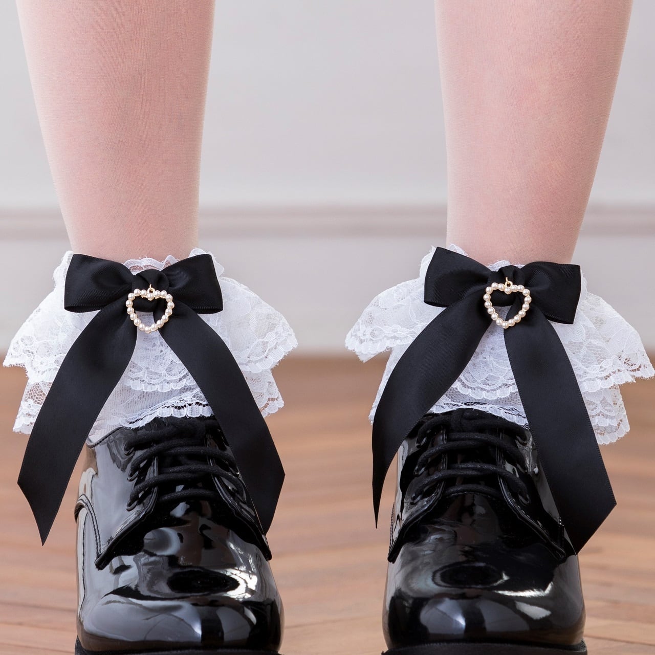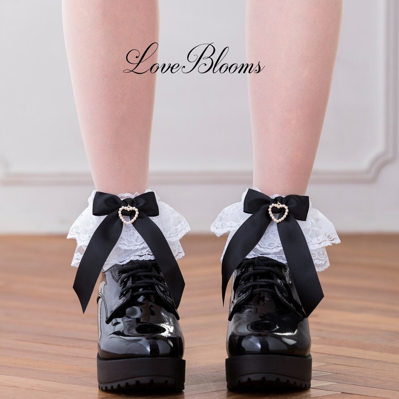 【送料無料】ハートチャーム リボン フリルレース ソックス 黒 白 レディース 靴下 量産型 地雷系 ロリータ LB17116