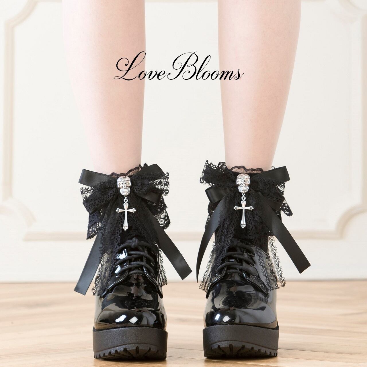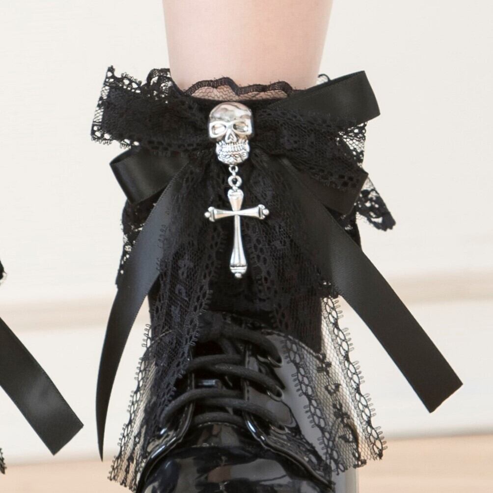 【送料無料】ドクロ クロスチャーム リボン フリルレース ソックス 黒 ブラック レディース 靴下 量産型 地雷系 サブカル系 LB17122