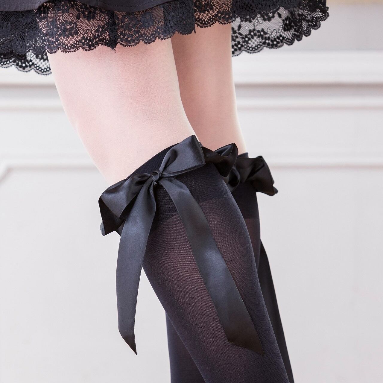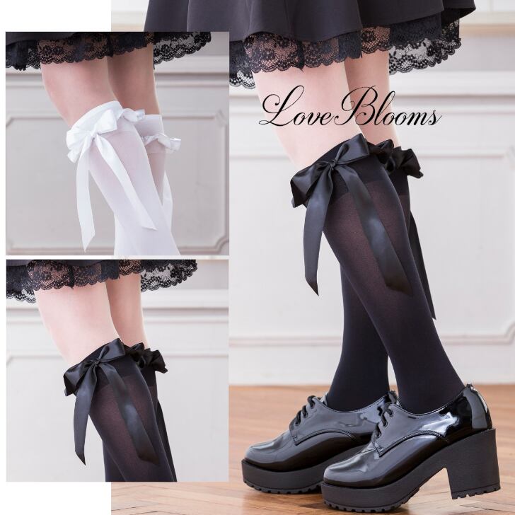 【送料無料】フリル リボン ハイソックス 黒 白 レディース 靴下 量産型 地雷系 ロリータ LB32150