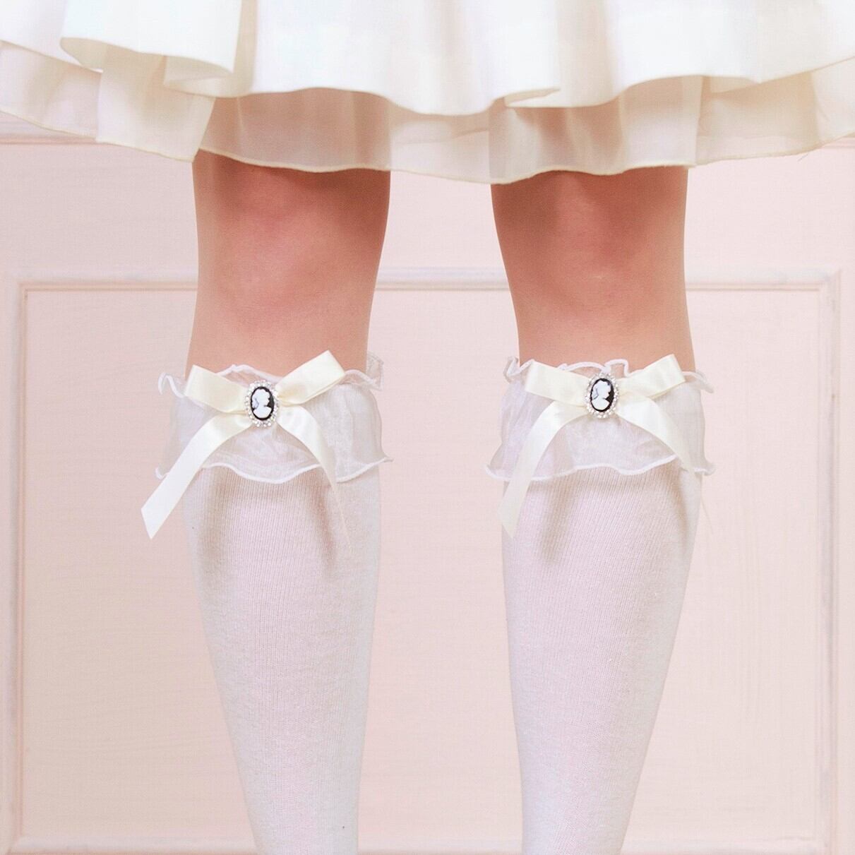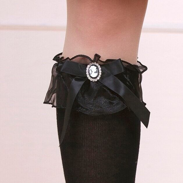 【送料無料】カメオ リボン フリルチュール ハイソックス 黒 白 レディース 靴下 量産型 地雷系 ロリータ LB12938